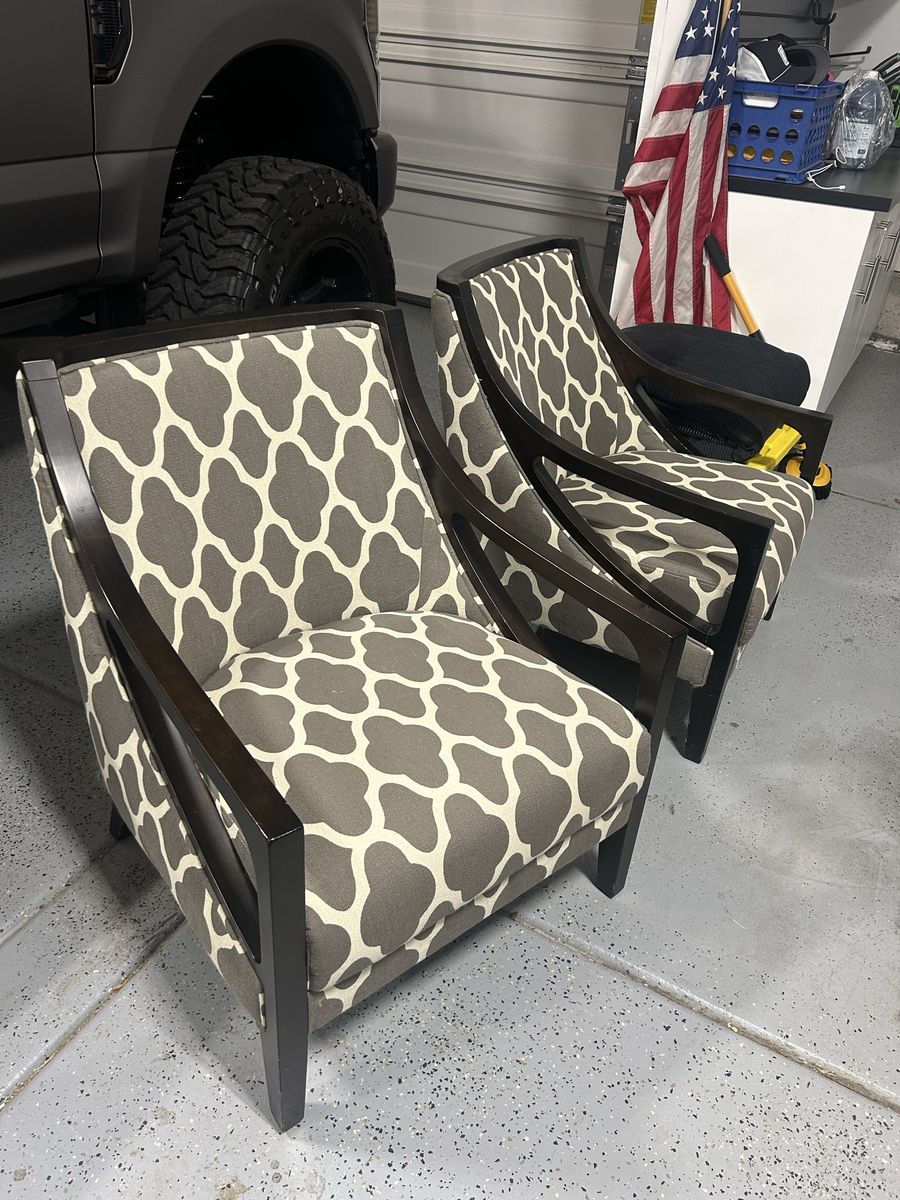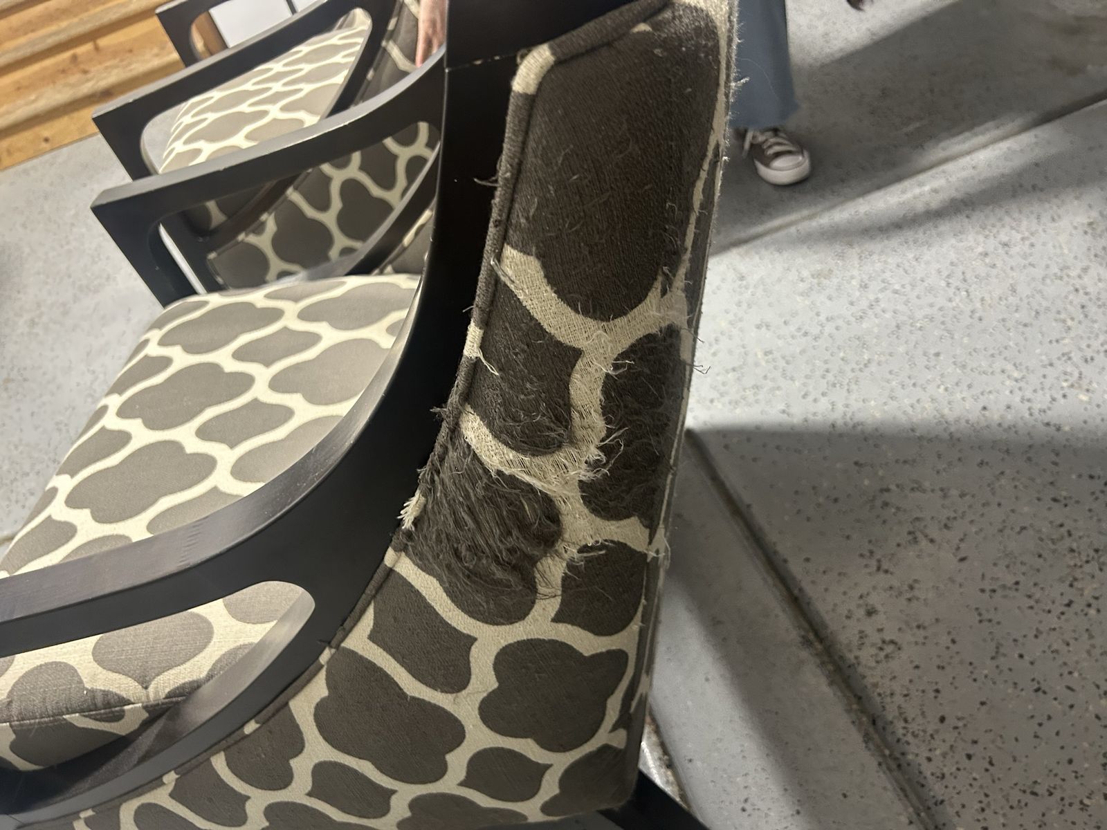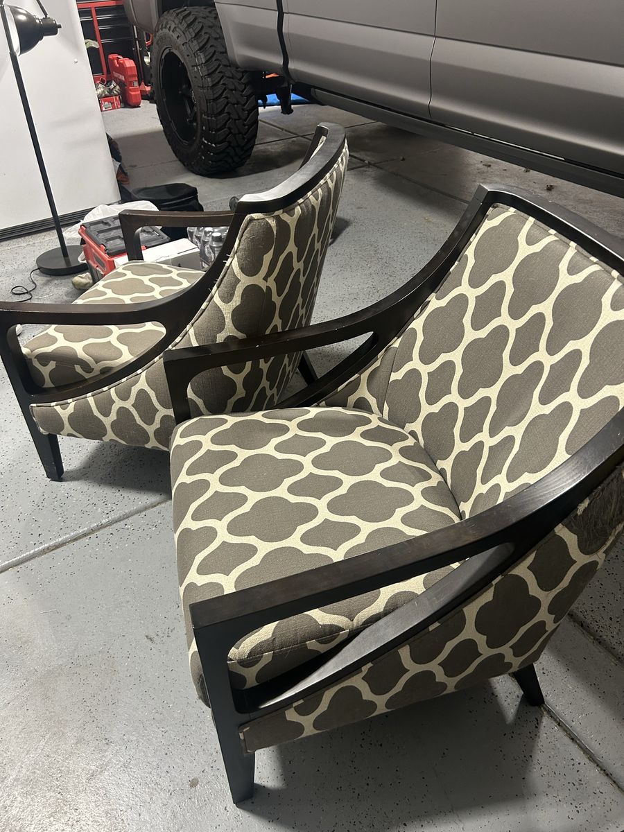 ApplePayDark chestnut wooden chairs with grey and cream upholstery. Has some cat stratches as shown in last photo. Easy to hide if you have it against a wall. Great for reupholstering since they are sturdy nice wood.