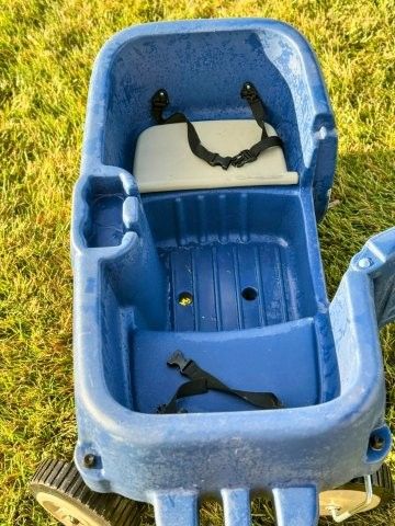 This very clean and durable blue plastic wagon is perfect for family adventures. It comfortably seats two, featuring seatbelts and an easy-access swing-out door. It comes with all the conveniences: built-in cup holders, a secret under-seat storage compartment, and a handle that folds down for easy transport. Ready for the park, the beach, or just around the neighborhood!