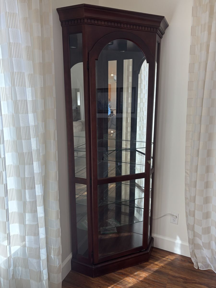 Corner Cherry Curio Cabinet with 7 glass shelves that have plate groves. All glass and mirrors are in perfect condition. The outside dimensions are 24 3/4” along the backs from the corner, 8” sides, and 23 1/2” across the front. The glass shelves are 21” along the backs, 7 1/4” sides, and 19 1/2” across the front. The clear opening of the door is 19 1/4”. The height is 80 inches. $100 Located near Weber State University in Ogden. Please text or call (719)406-8206.