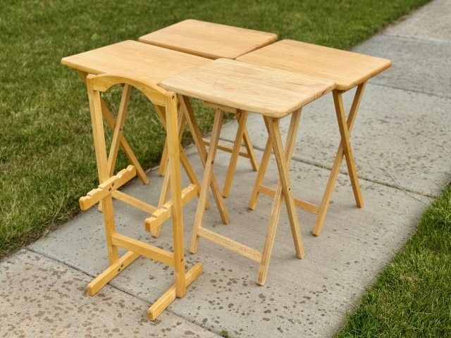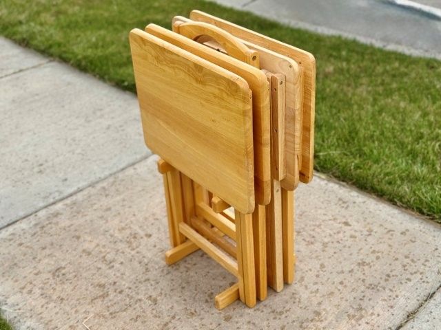 Solid Wood 5-Piece TV Tray Set Includes 4 folding tables and a matching storage stand. Classic oak finish, sturdy construction, and space-saving design. Excellent condition.