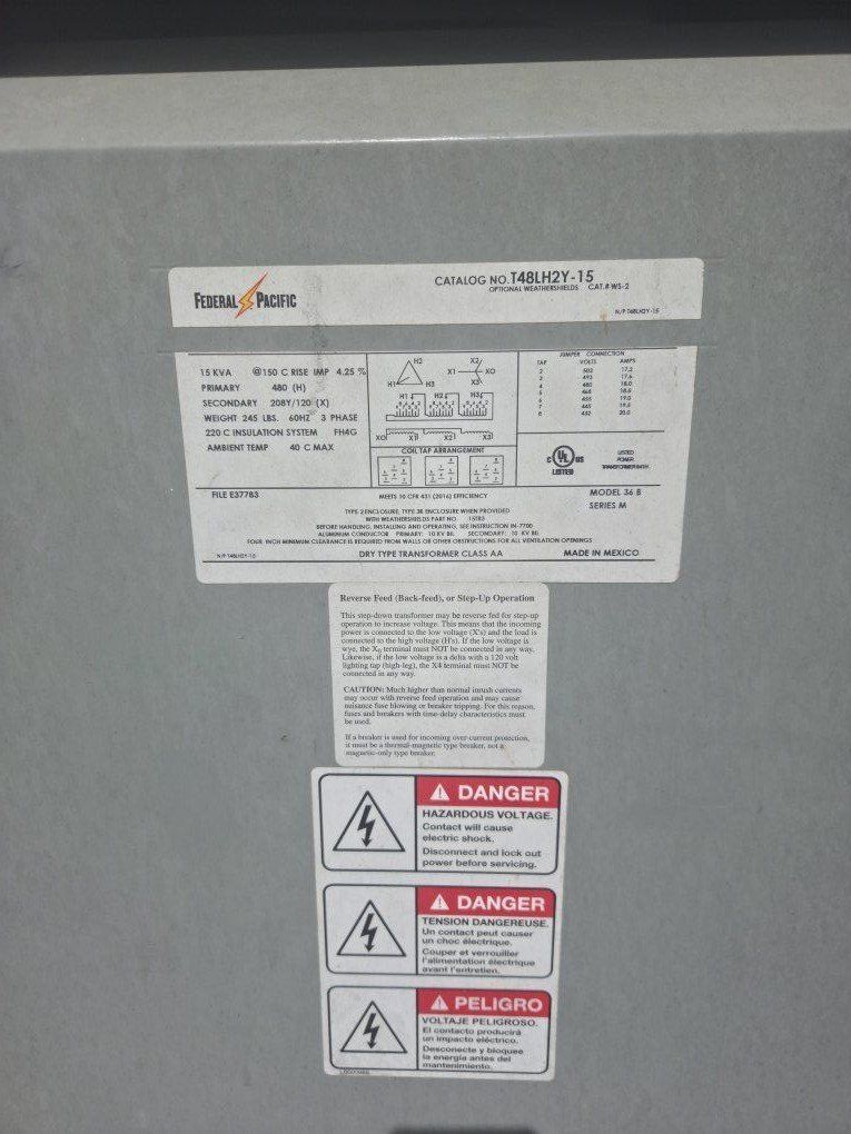VenmoFor sale: Federal Pacific 15 kVA dry-type ventilated transformer, catalog # T48LH2Y-15.Primary: 480V Delta Secondary: 208Y/120V 3-phase, 60 Hz, aluminum windings 150°C temperature rise Dimensions: approx. 29" H x 17" W x 19.4" D Weight: ~245 lbs This is a reliable step-down transformer commonly used in industrial, commercial, or shop applications. Pulled from working equipment