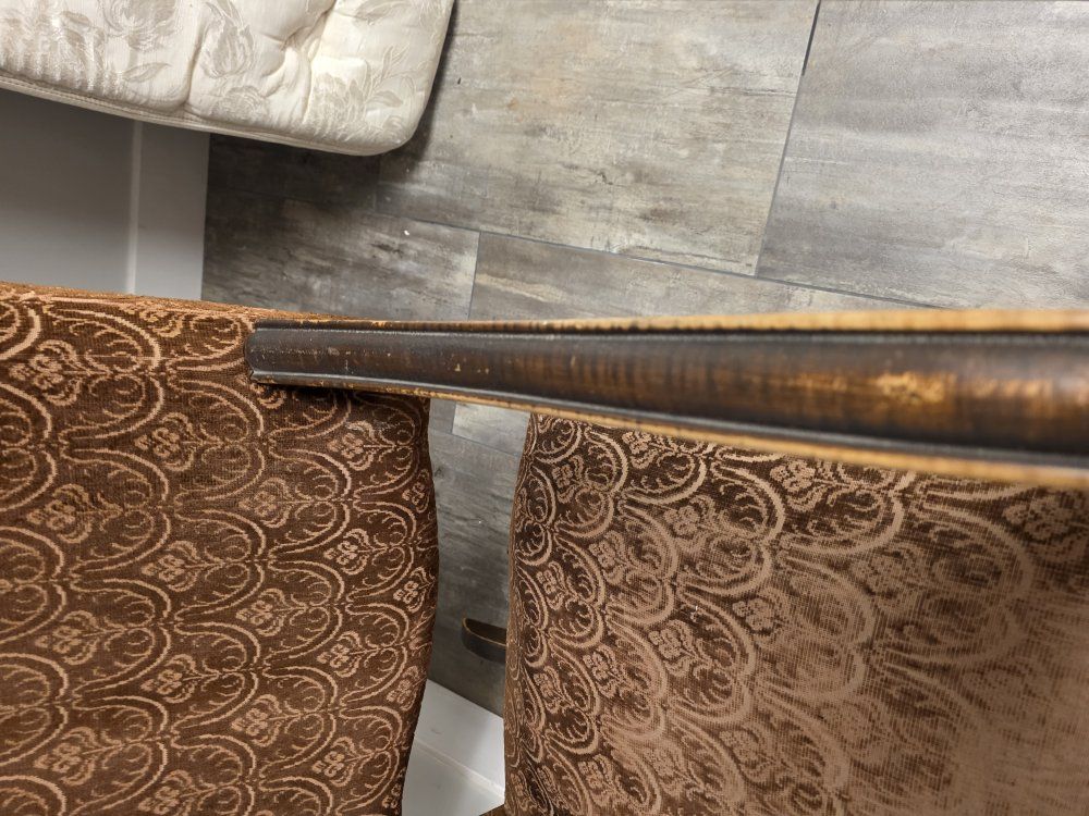 This chair has lived a full life! The seat has a noticeable divot/slump from use and will likely need some structural attention or re-padding. The wood frame also shows its age and would look spectacular with a fresh refinishing or a deep polish.