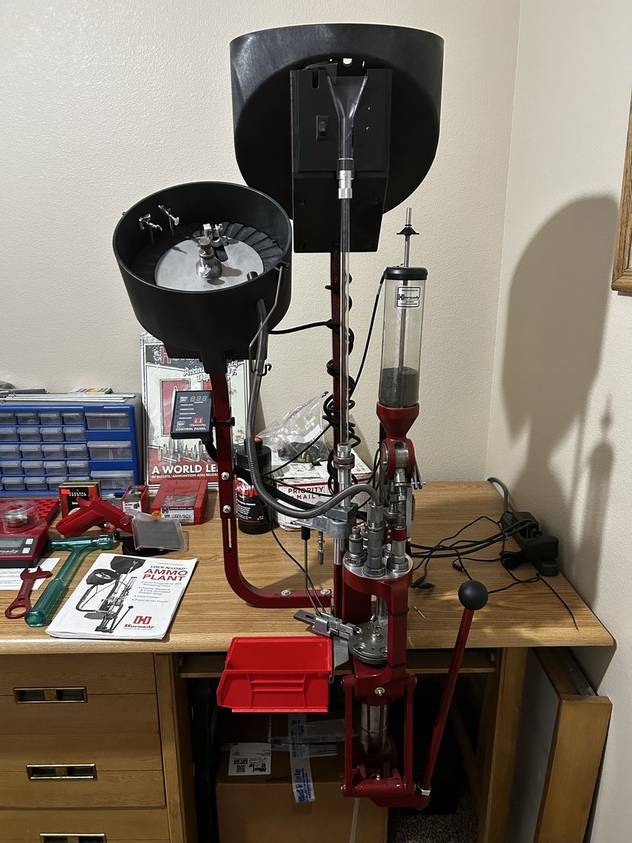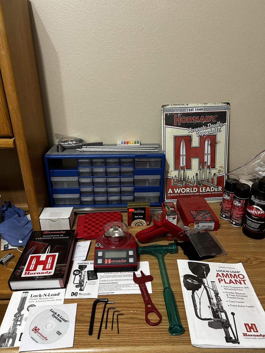VenmoComplete set with all parts. Electronic counter is the only thing that doesn’t work. 9mm dies, 200+ primers, 100+ bullets, hundreds of brass, small amount of powder, electronic bench scale, Hornady reloading manual and all original manuals for press.
