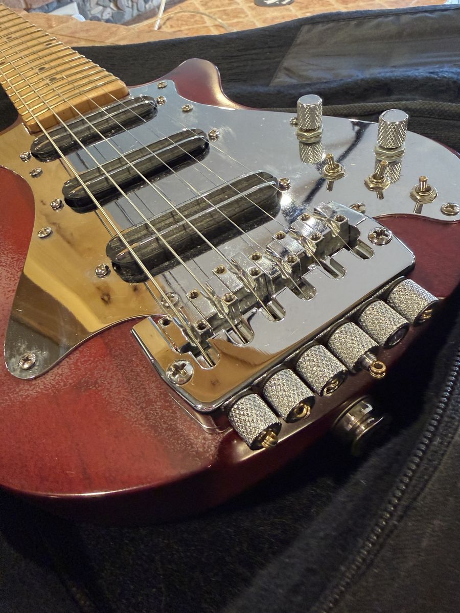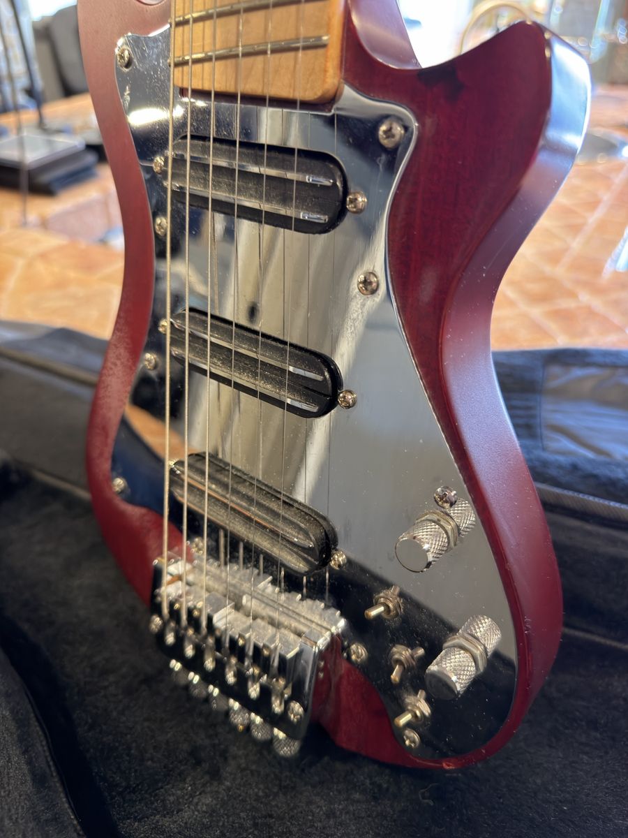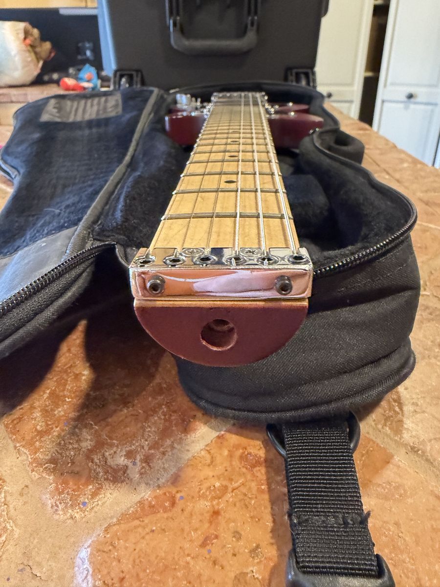 Venmothis guitar is in good condition and is a solid body electric. All pick ups are working and knobs as well. excellent for travel and to plug-in for some great sound. Comes with a soft case.