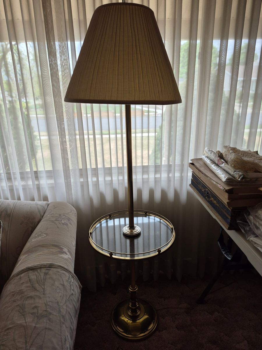 Vintage brass/glass floor lamp. Item is in great condition. Dimensions: 59"H x 16"diameter of glass "table". Table is at 21". FCFS. Cash only. Thanks for looking!