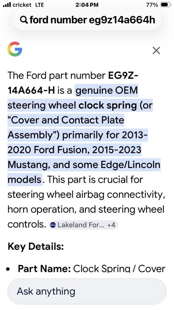 CashAppBought for a 2017 ford fusion but not the correct one.my car has heated steering wheel and this part does not support that option.new never installed.box is missing for part number but images for fitment might help you.paid 129 and shipping.first 50 bucks takes it.Dennis.801.five four nine 8269.text is best.