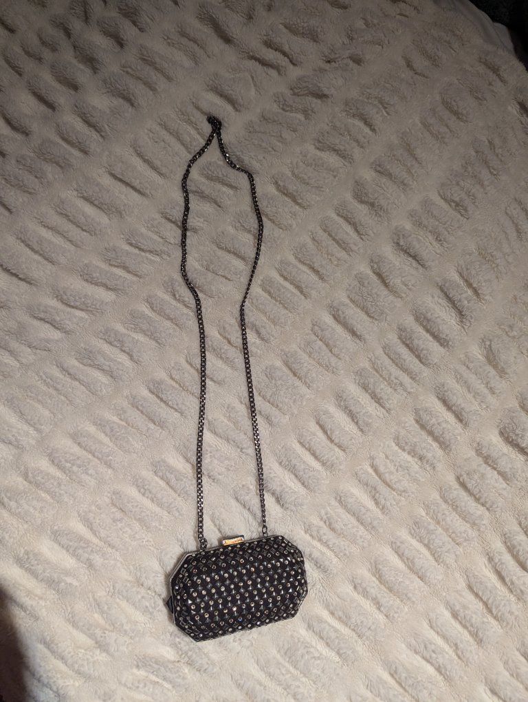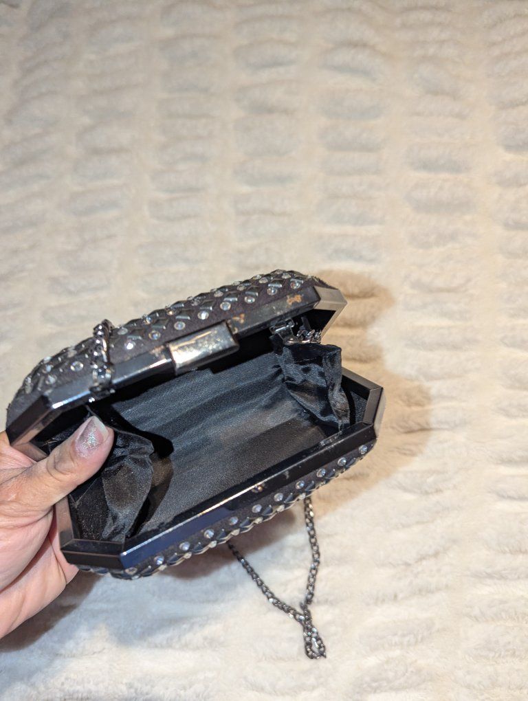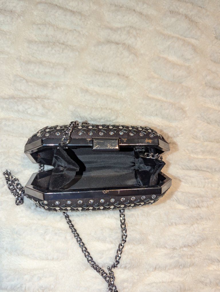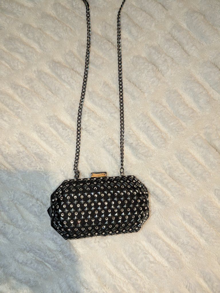Zelleobsessed with this bag but I just don’t use it anymore super cute black clutch with silver studs + rhinestones