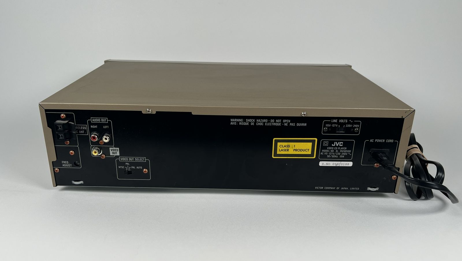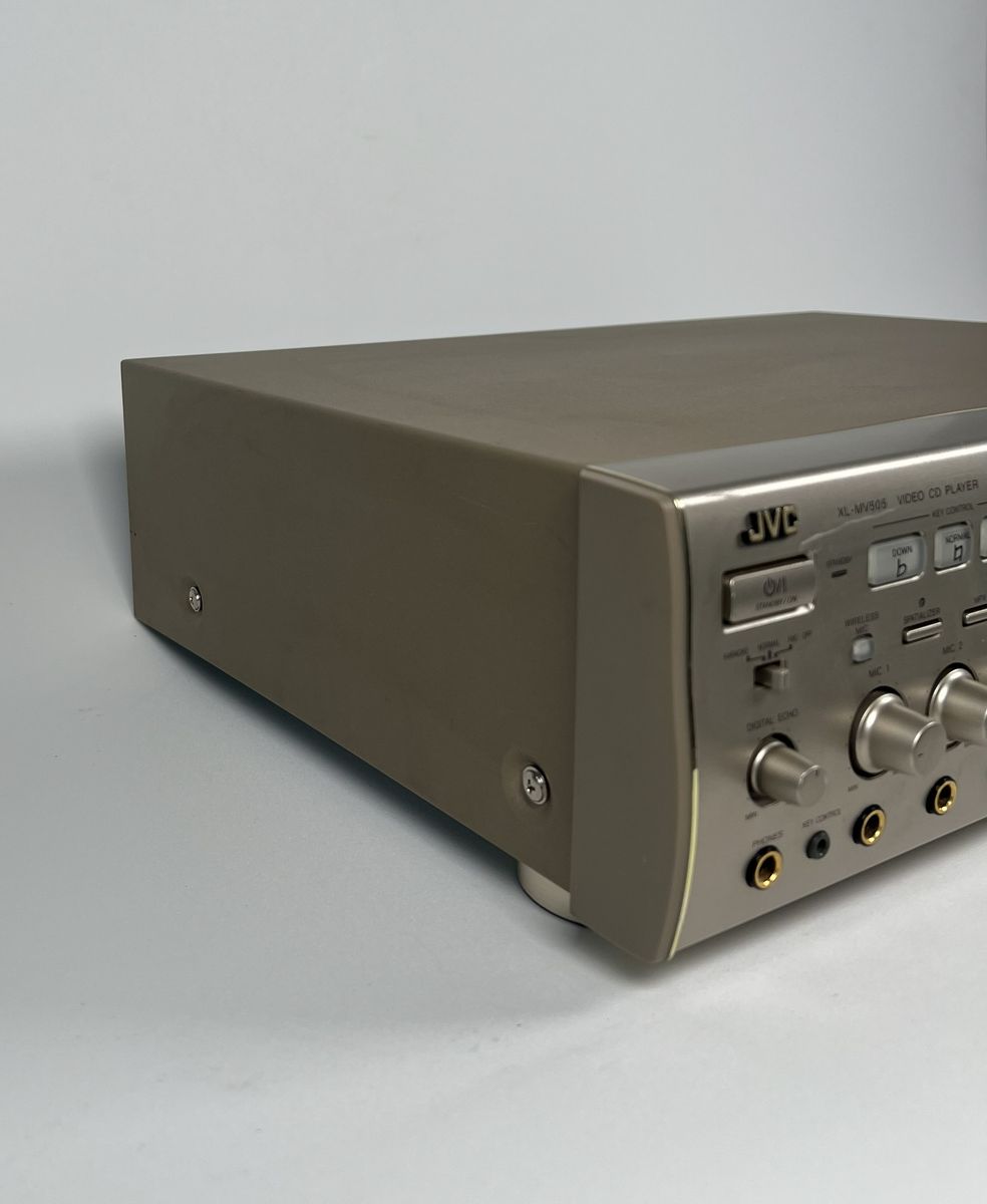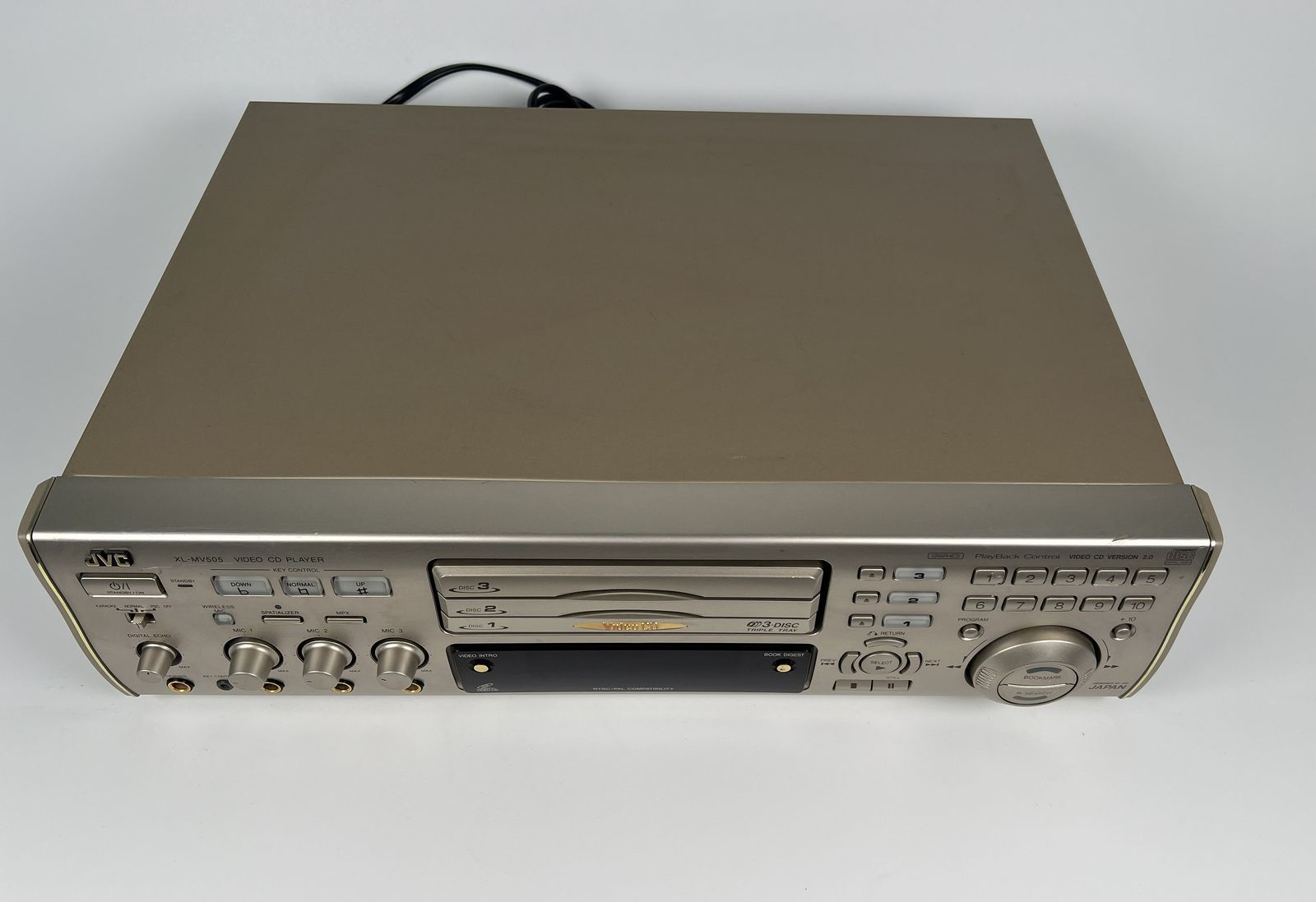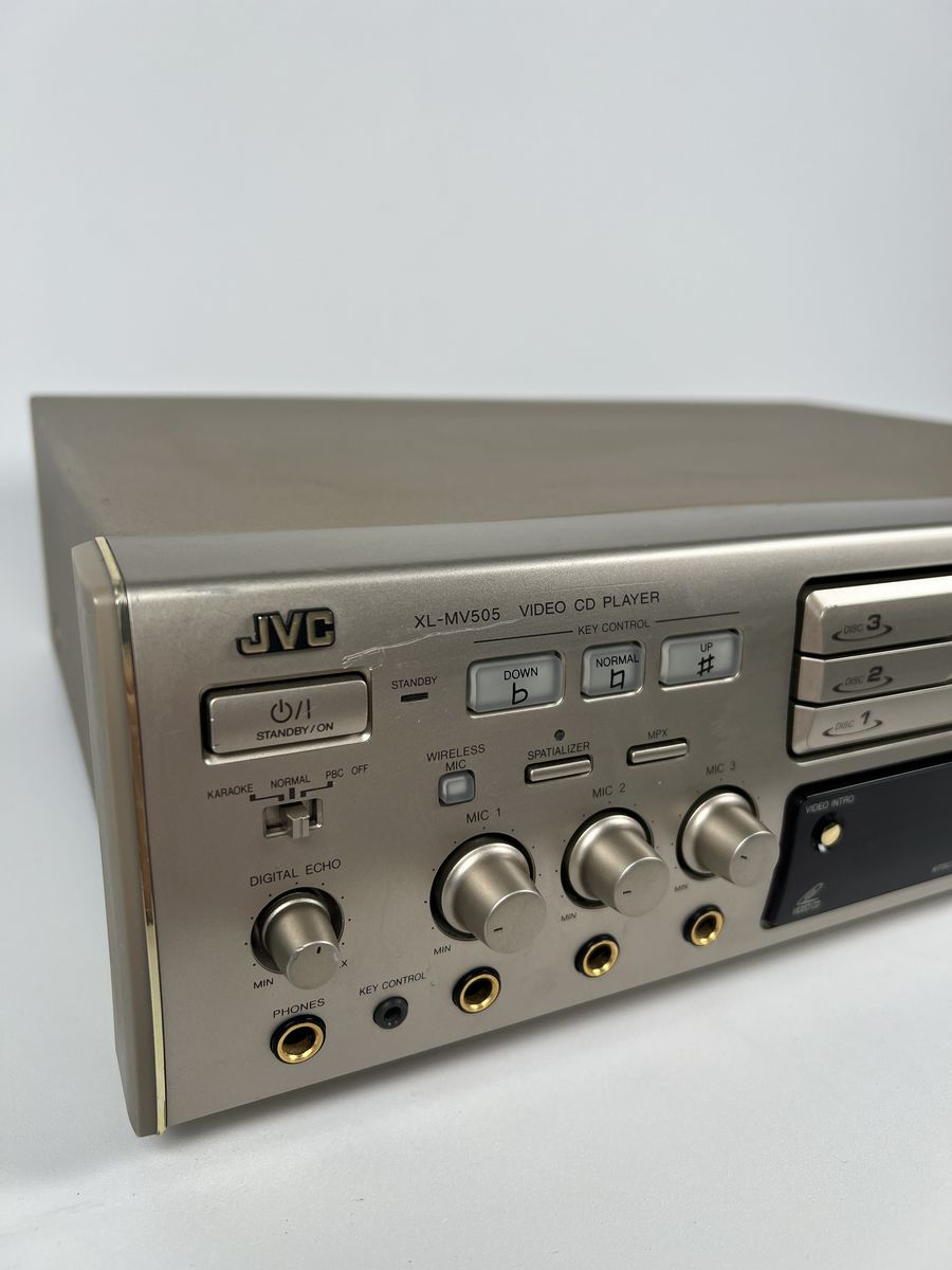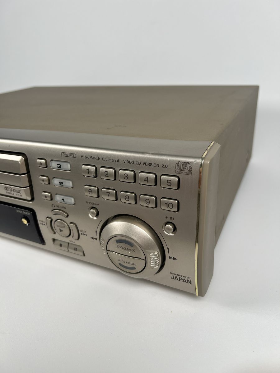 This vintage JVC XL-MV505 3-disc Video CD player powers on and works for basic use. It plays standard audio CDs from all three disc slots without issue.