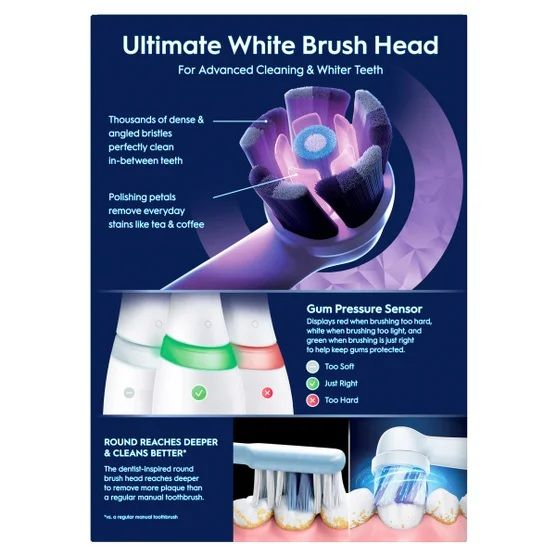 The Oral-B iO Perfect Clean & Whiten Electric Rechargeable Toothbrush removes plaque & surface stains starting day 1. The dentist-inspired round brush head surrounds each tooth to remove more plaque along the gumline vs a regular manual toothbrush.