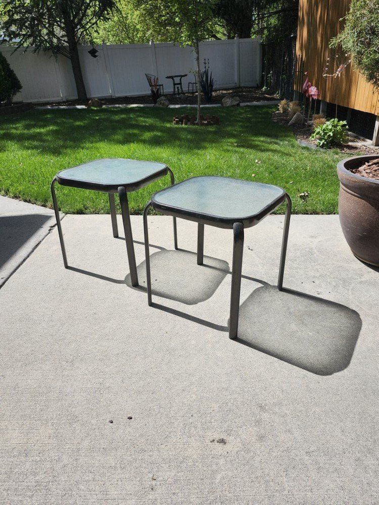 Patio tables. Nice glass topped and metal legs. Approximately 16 inches by 16 inches and 17 inches tall. CASH only.