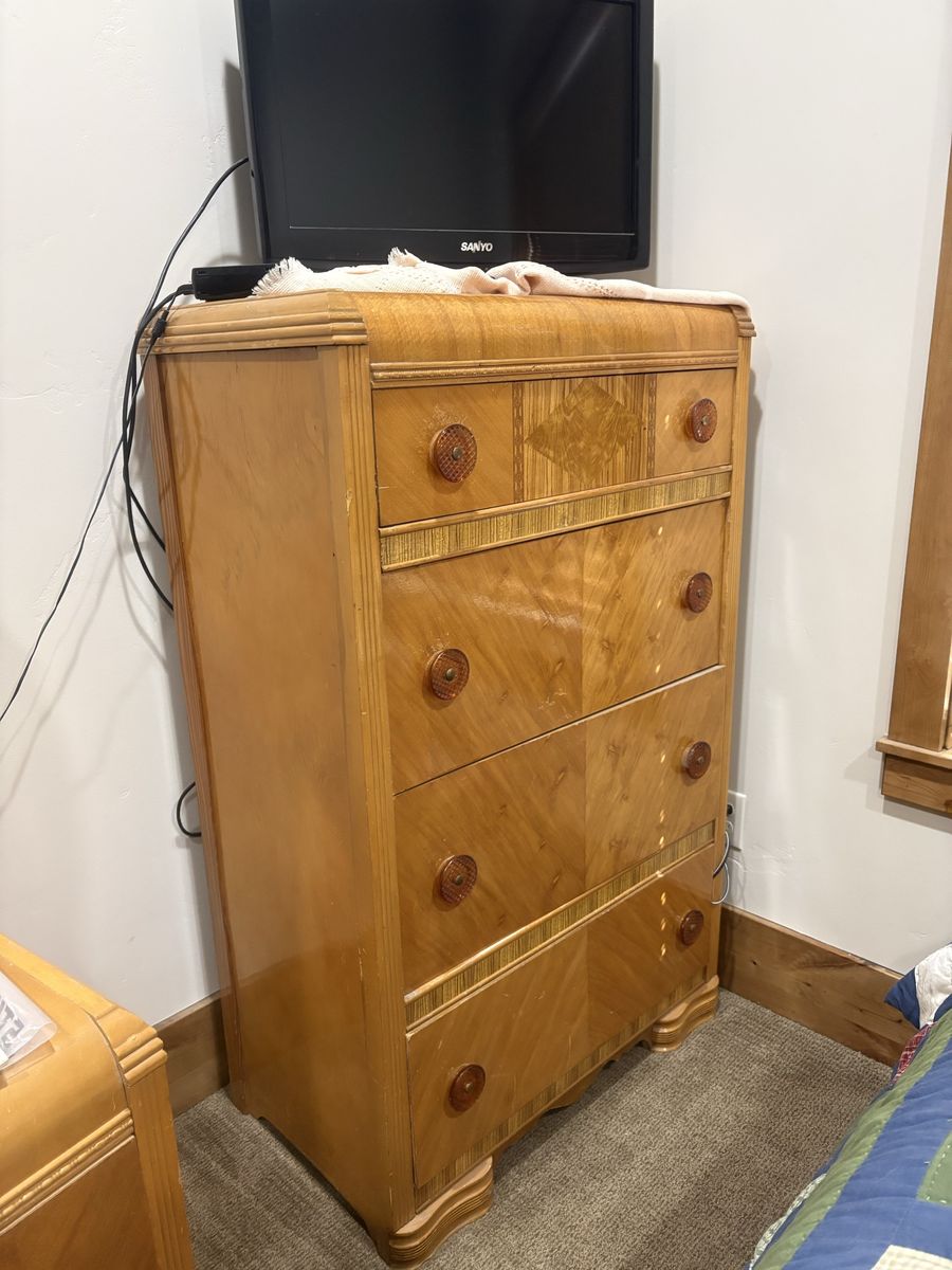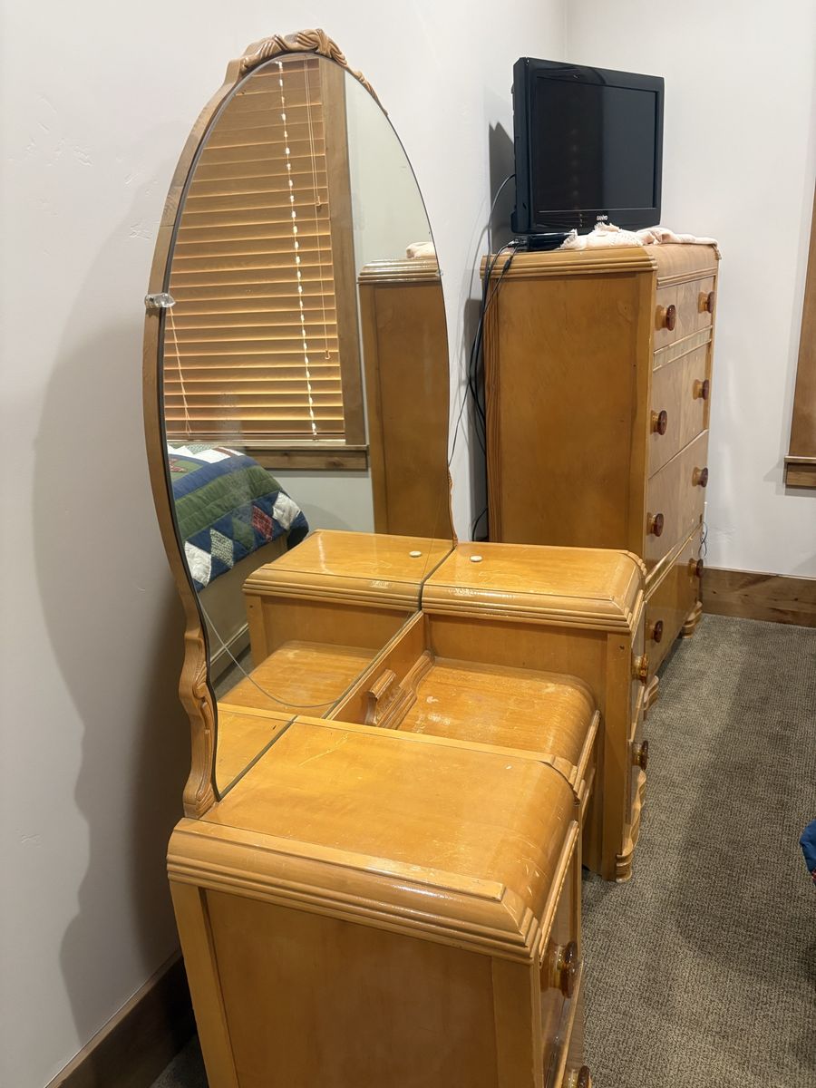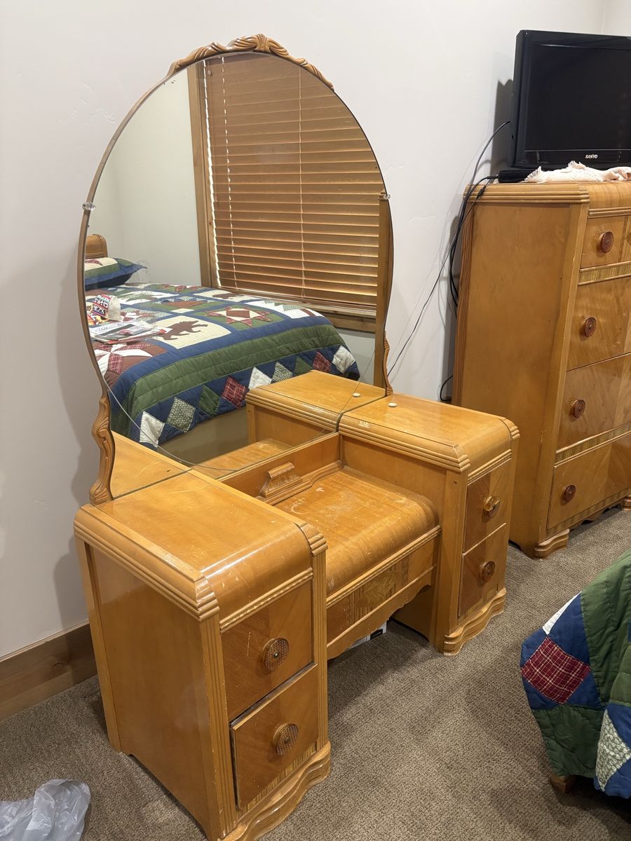 Antique set, queen, includes headboard,footboard, nightstand,& vanity with mirror. Excellent condition, moving and don’t need it. Vanity w/mirror 46 W 18 D 65 inches tall