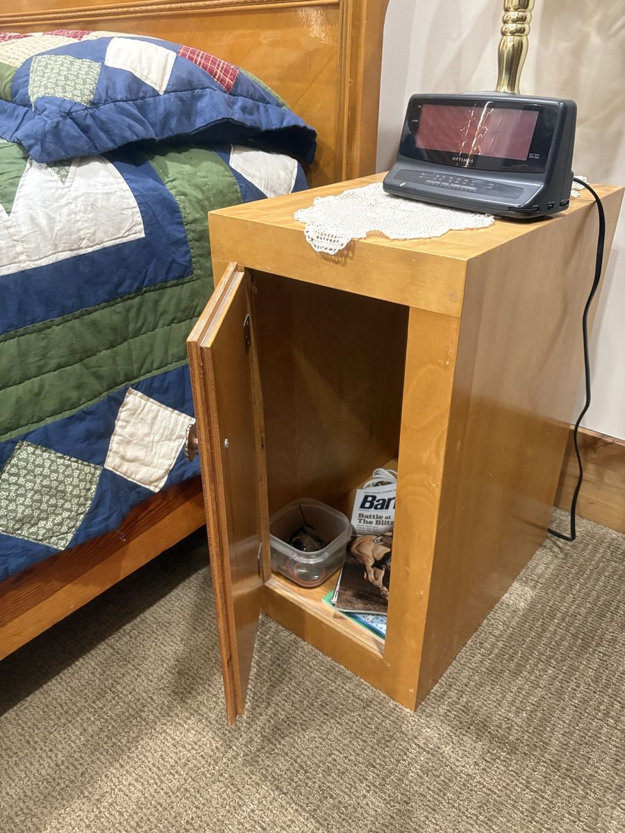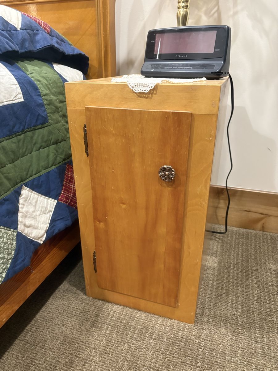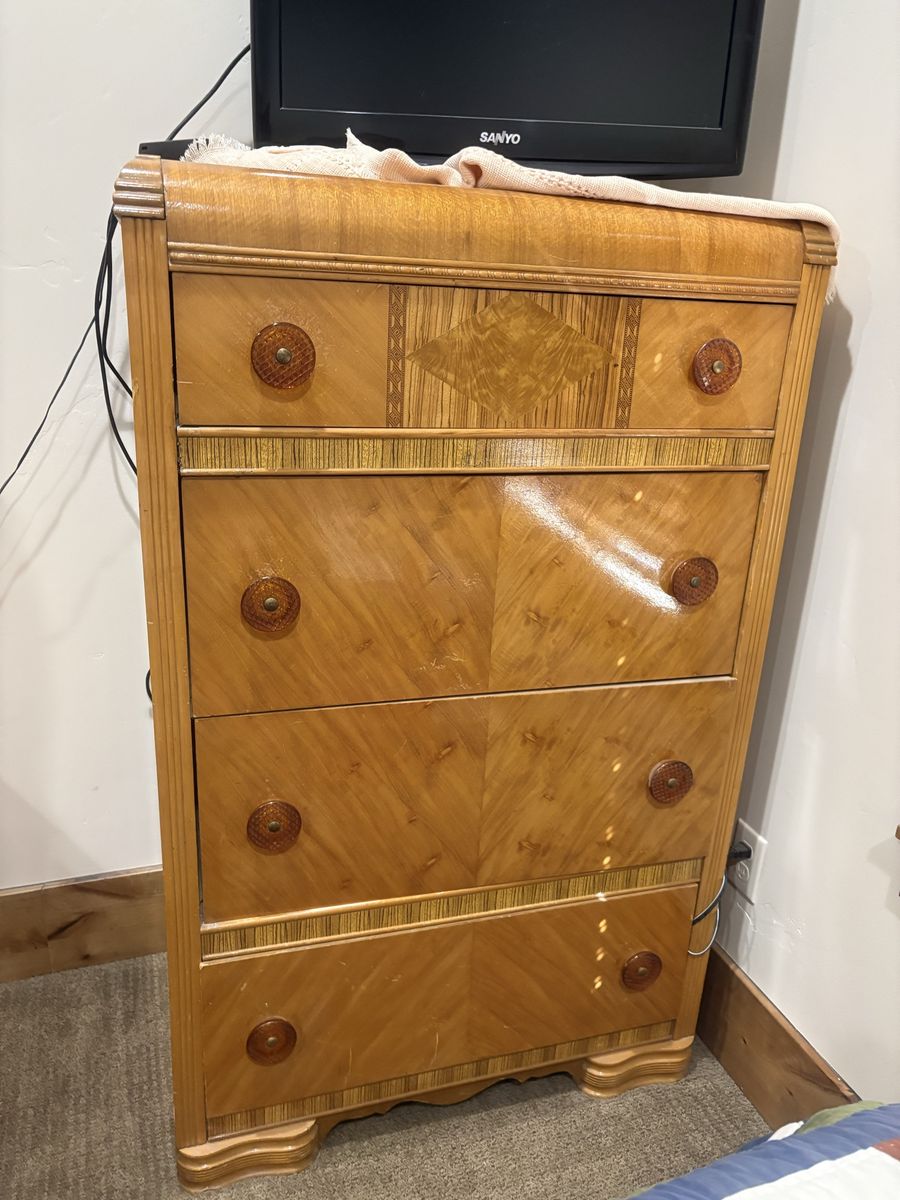 Antique set, queen, includes headboard,footboard, nightstand,& vanity with mirror. Excellent condition, moving and don’t need it. Vanity w/mirror 46 W 18 D 65 inches tall