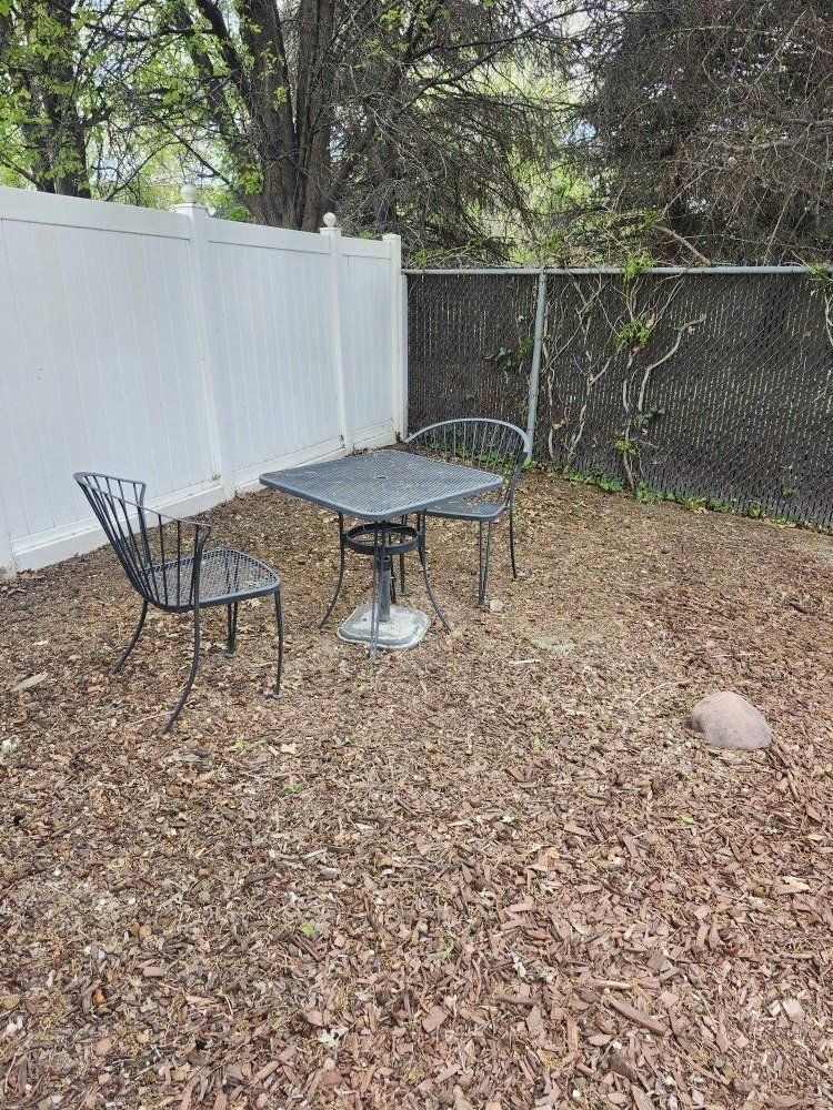 Small wrought iron patio set. Table approximately 28 inches square, 2 chairs, as shown. CASH only.