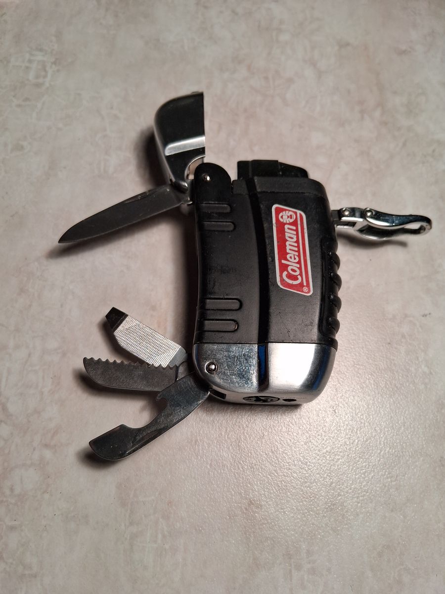 Never used Coleman Multi-tool. Has refillable butane lighter (it sparks but never filled), knife blade, serrated saw, double-sided metal file and bottle/can opener. Would make a cool gift or small camp/pocket tool. 3in tall, 1 3/4 wide.