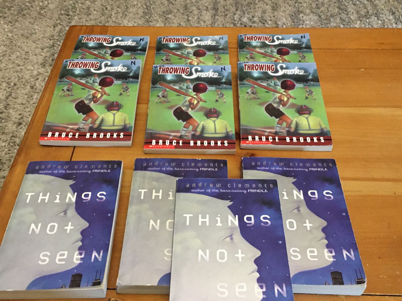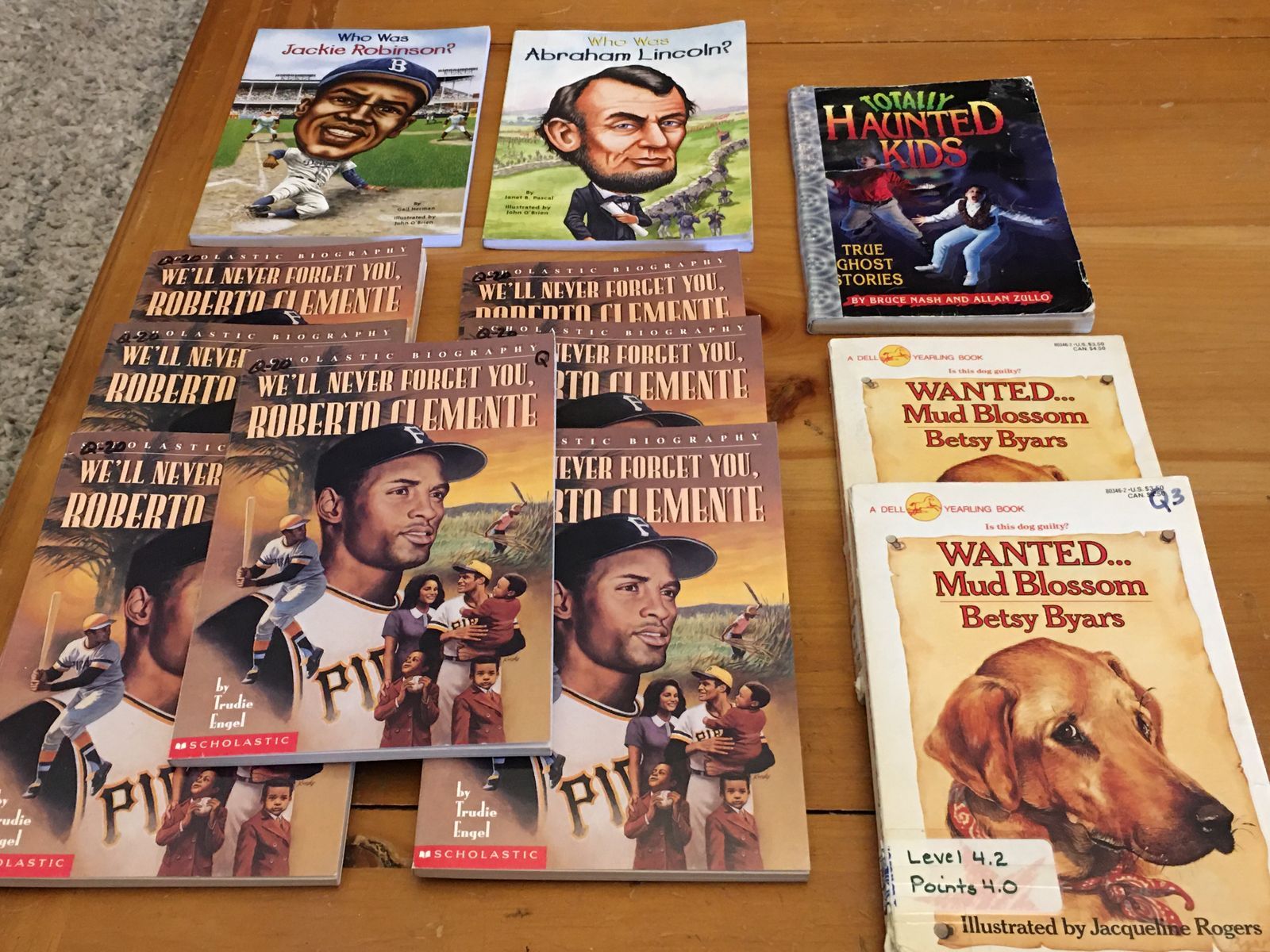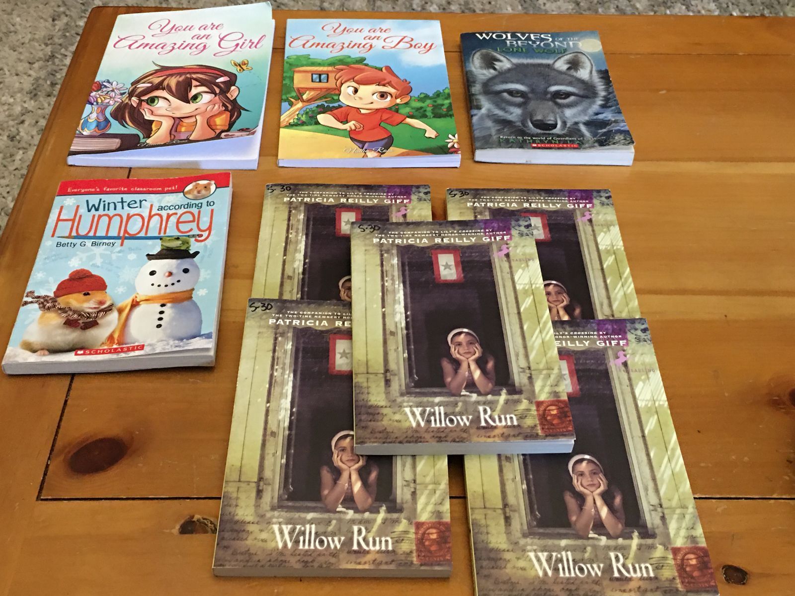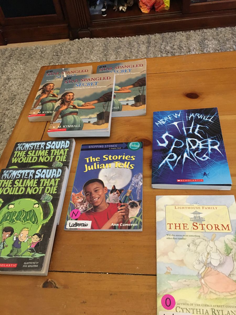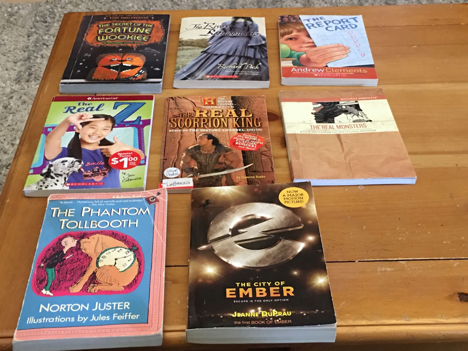 Almost home $4, alien for rent, Anne of Green Gables $4, SOLD (2 book set) Animorphs $4 for both, series of unfortunate events $4, long way from Chicago, (5 new books) Aleutian sparrow $3 each, a house called awful end, a dog’s life, 13 ghostly tales, Wednesday wars $5, the war with Grandpa, there’s a boy in the girls bathroom $4, (4 books) things not seen $4 each, (6 new books) throwing smoke $3 each, Wall E, (2 new books) vet volunteers series $8 for both, (7 books) touchdown for Tommy $3 each, (2 book set) who was Abraham Lincoln/Jackie Robinson $6 for both, totally haunted kids $1.00, (2 books) wanted mud blossom $4 each, (7 new books) well never forget you Roberto Clemente, (2 book set) you are an amazing girl/boy $9 for both, lone wolf , (2 books) winter according to Humphrey, (5 new books) Willow run $3 each, the river between us, real Scorpion 🦂 King $3, phantom tollbooth $4, the real z, (2 books) the report card $4 each, city of Ember $5, secret of the fortune Wookiee $3.50, (8 book set, 2 books not pictured) Magic tree house series $30 for all 8, the storm, the spider ring $3, (2 books) the slime that wouldn’t die $3 each, stories Julian tells, (3 new books) star spangled secret $4 each.