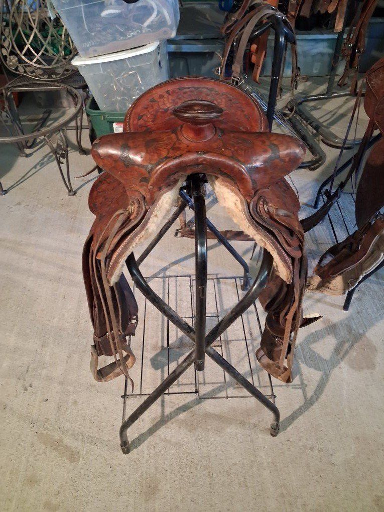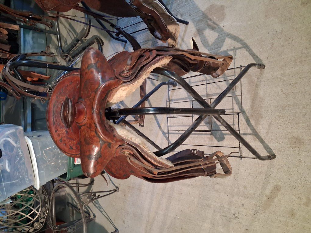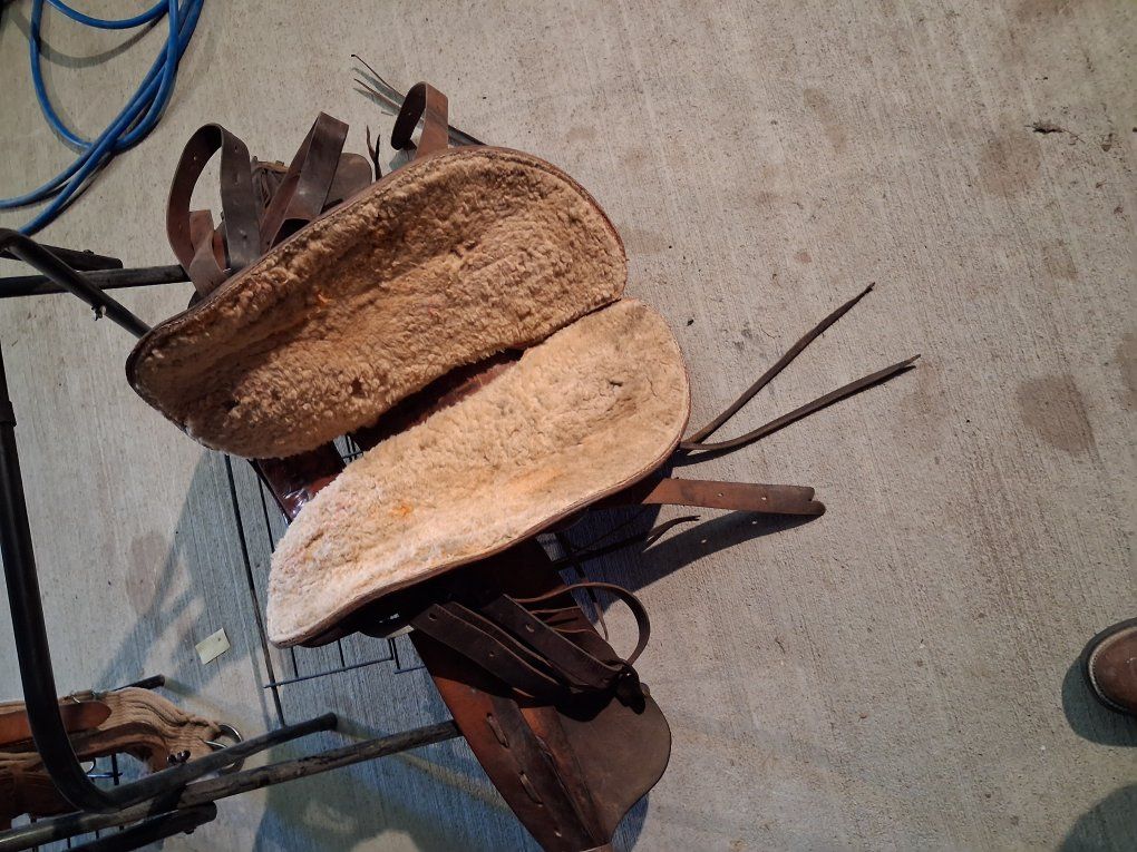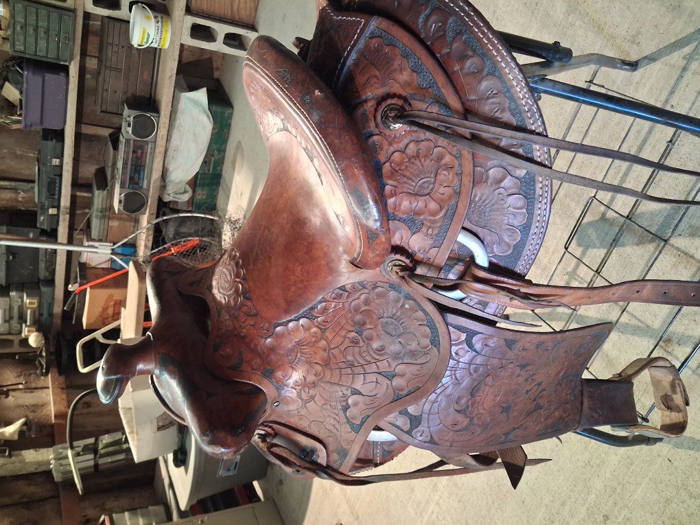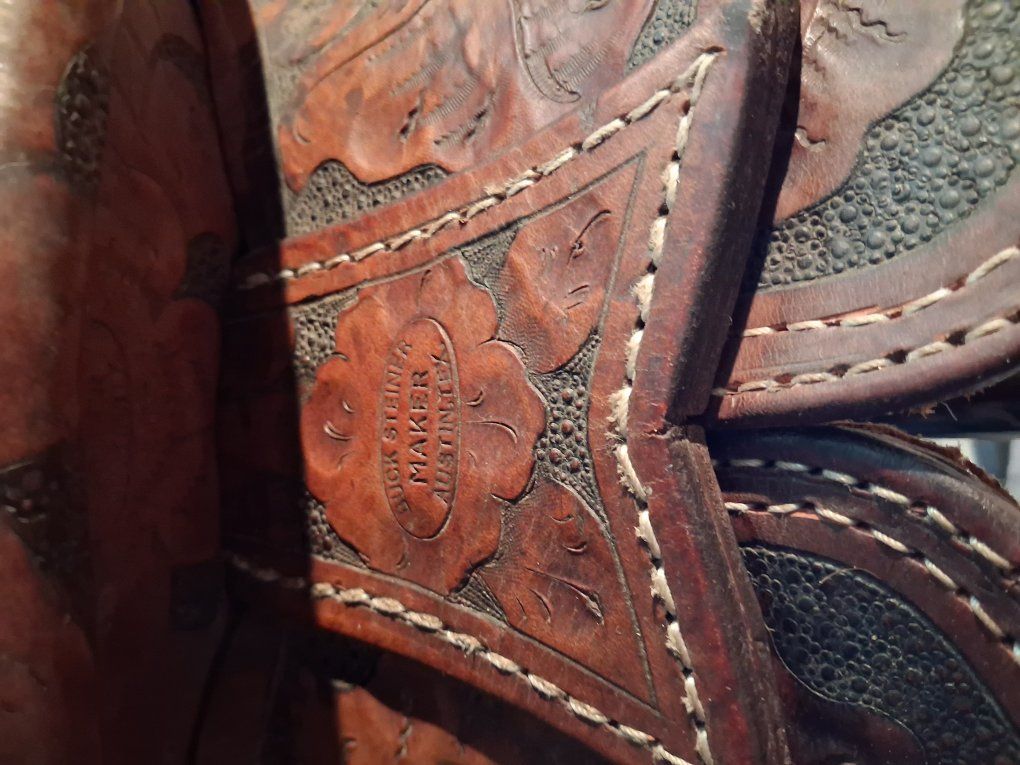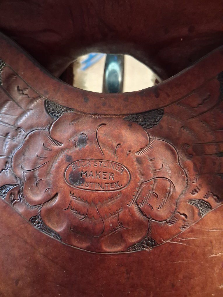 Buck Steiner Austin Texas 14 in seat 8 in gullet 24 in round skirt floral tooling. Stitching has been redone has wool fleece , solid saddle.