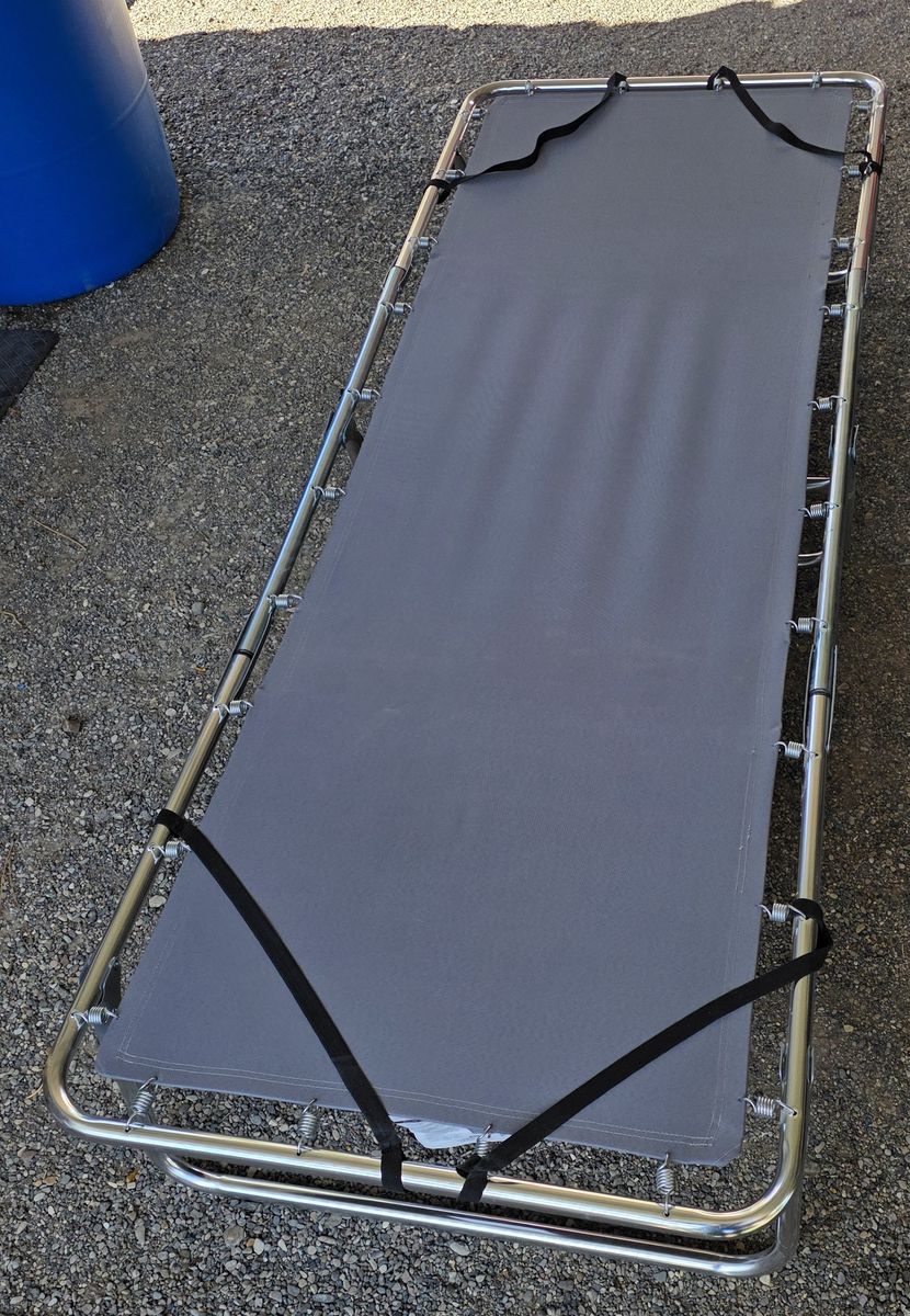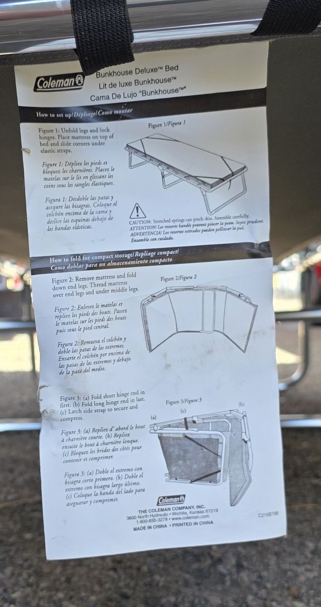 ZellePerfect for getaways to the cabin or for offering an overnight guest in your home, the Coleman Bunkhouse Deluxe Bed features a raised sleeping area that measures 30 by 80 inches--just right for sleepers up to 6 feet, 6 inches tall. It features a spring construction for a bed-like feel and can accommodate a 1.5-inch foam padded mattress (not included). It also features elastic straps to keep the mattress in place and a rust-resistant aluminum frame. This bed folds down to compact size for storage. Due to shape and size, no shipping. Pick up here in Heyburn.