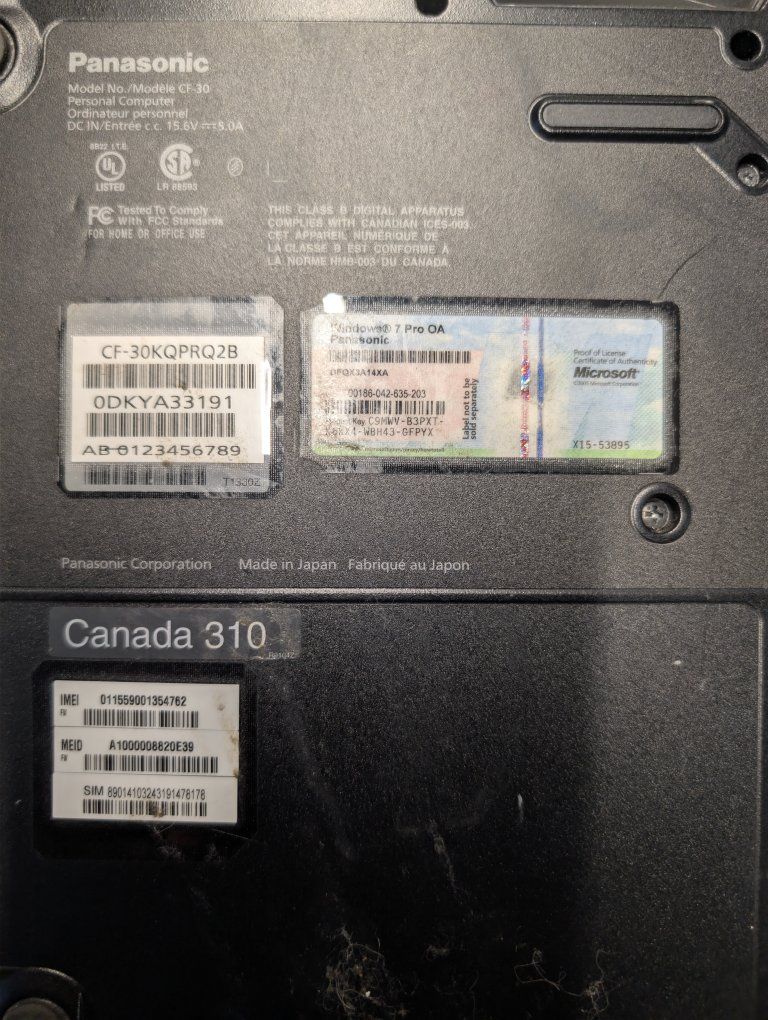 ZelleModel: Toughbook CF-30 (Specific Model: CF-30KQPRQ2B) Condition: For Parts / Not Working. This unit is being sold in unknown/untested condition. Technical Status: Power/Display: Untested. I do not have the specific Panasonic power adapter required to test this unit. Internal Components: Unknown. It is unverified if the hard drive, caddy, or RAM are present. Cellular Data: Includes a Gobi mobile broadband module (IMEI/MEID and SIM card slot visible). Operating System: Features a clear Windows 7 Pro OA Certificate of Authenticity (COA) sticker with a visible product key. Physical Condition: Ruggedized chassis shows signs of dust and previous use but appears structurally sound. Port covers and handle integrity have not been fully inspected. Includes: Laptop unit only. Not Included: AC Power Adapter, HDD Caddy (unverified), or original accessories. Note: Sold AS-IS for parts, repair, or collection. No returns. Perfect for someone needing a donor chassis or high-quality magnesium alloy replacement parts.
