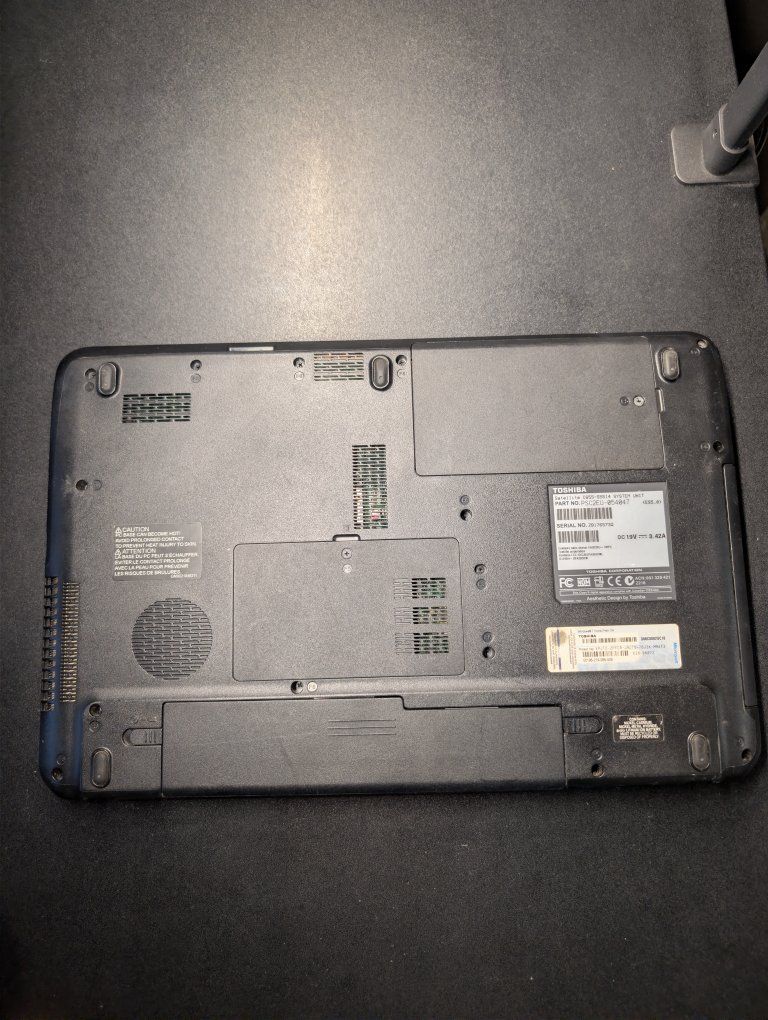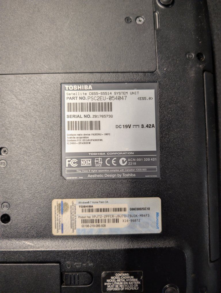 ZelleBrand: Toshiba Model: Satellite C655-S5514 Part Number: PSC2EU-054047 Screen Size: 15.6" Technical Status: Power/Testing: Untested. I do not have the compatible 19V 3.42A power adapter to verify if the unit posts. Internal Components: Unknown. Presence of hard drive and RAM has not been verified. Operating System: Includes a genuine Windows 7 Home Prem OA sticker with a clearly legible product key. Condition: For Parts / Not Working. This unit is being sold in untested condition for parts or repair. Physical Condition: The chassis shows typical signs of wear, dust, and use. Screen and keyboard appear physically intact, but functionality is unconfirmed. Includes: Laptop unit only. Not Included: AC Power Adapter, original box, or manuals. Note: Sold AS-IS with no returns or guarantees. This is a great donor unit for a technician or for a project build.