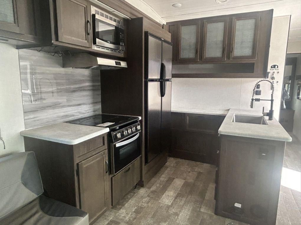 Trailer is in great shape. 37’ feet 100 gallon water, 30 gallon fuel station, 5500 Onan generator, King Bed, 2 queen drop down beds, additional couch and recliner (sleeps approx. 6-8), Double fridge, tires replaced last year. Upgraded 6V batteries, larger propane tanks, new cover included. Back magnetic screen is in great shape, drop down zero gravity door with external key lock and patio railing. Everything works great! Equalizer trailer hitch included at the right price.