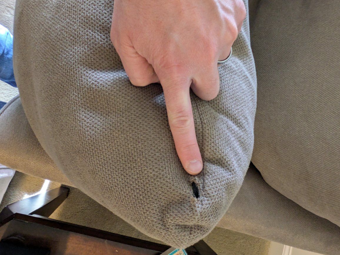 Still in good shape. One small repairable hole in a single upper cushion (pictured). Some standard wear on seat cushions.