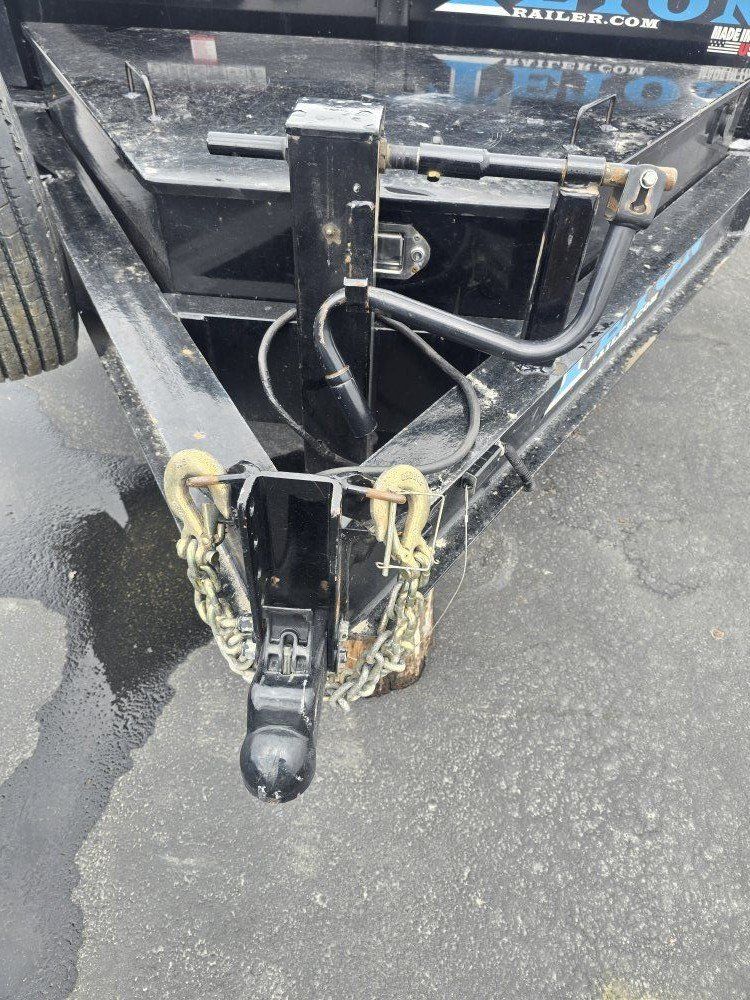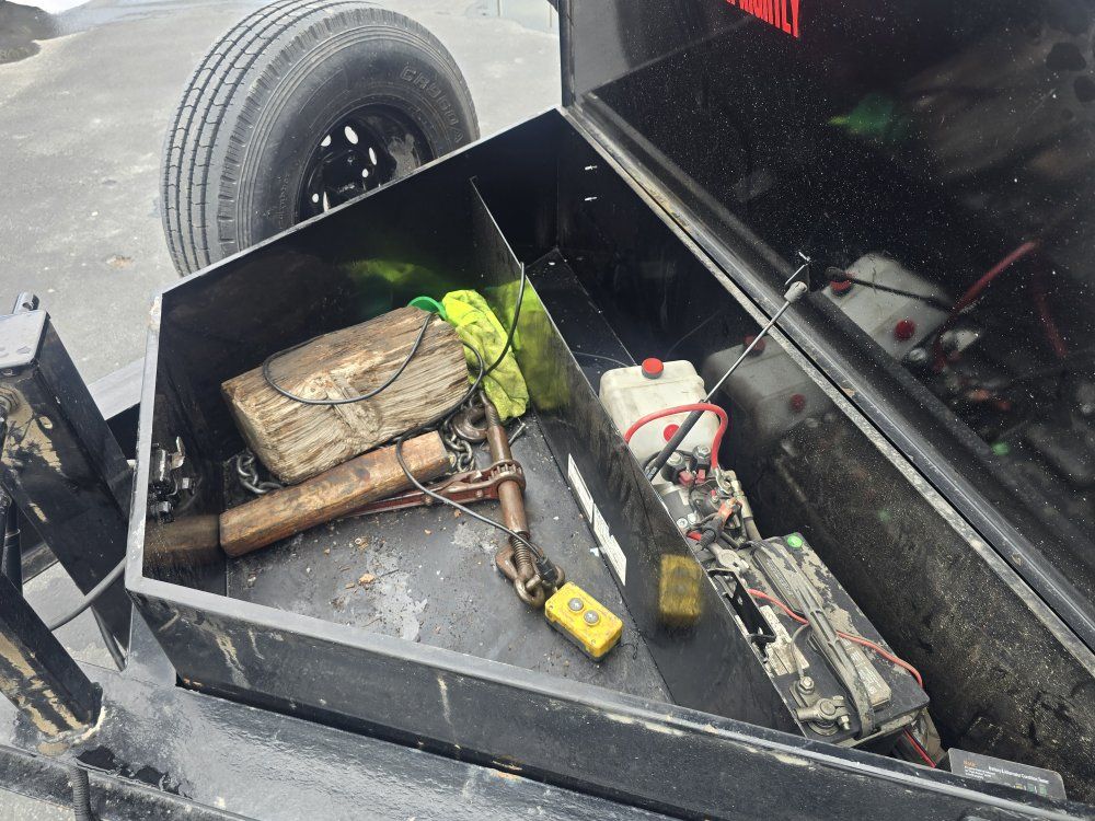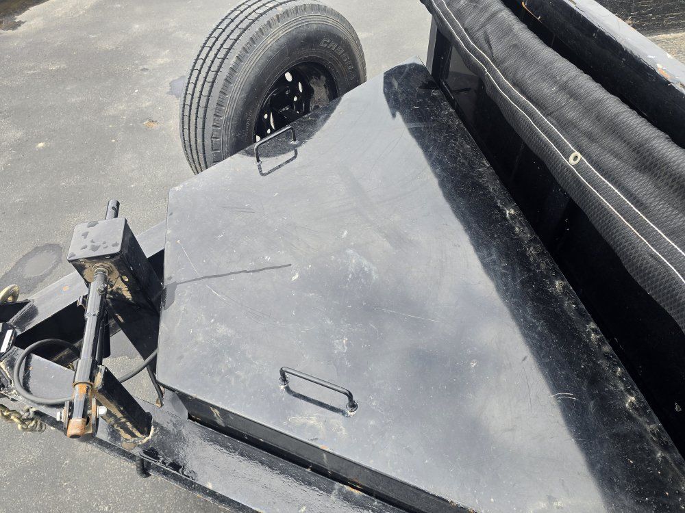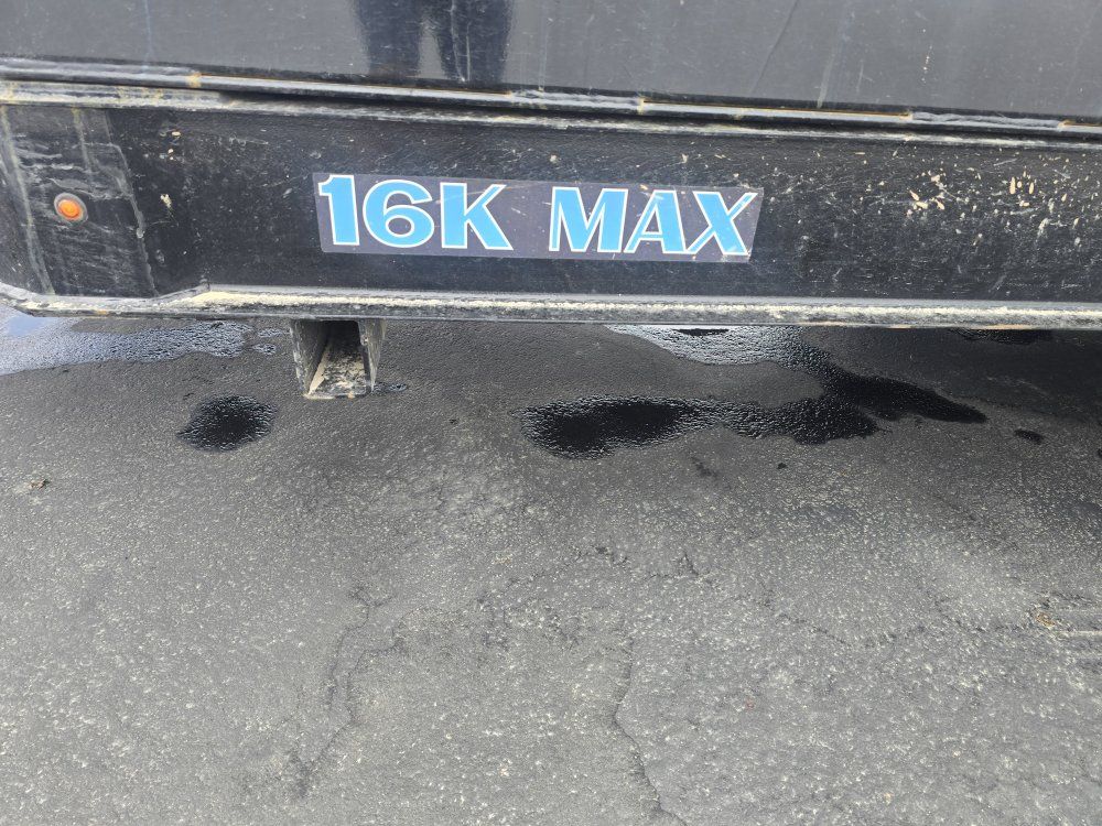 7' x 16' contractor-grade deck Full tubular framework 16,000 lb GVW 8k axles Upgraded 16‑ply tires 13 lb beam materials Spreader gate Heavy-duty ramps Tie-downs/tie-down tabs Tarp and battery included Large lockable storage compartment Spare tire