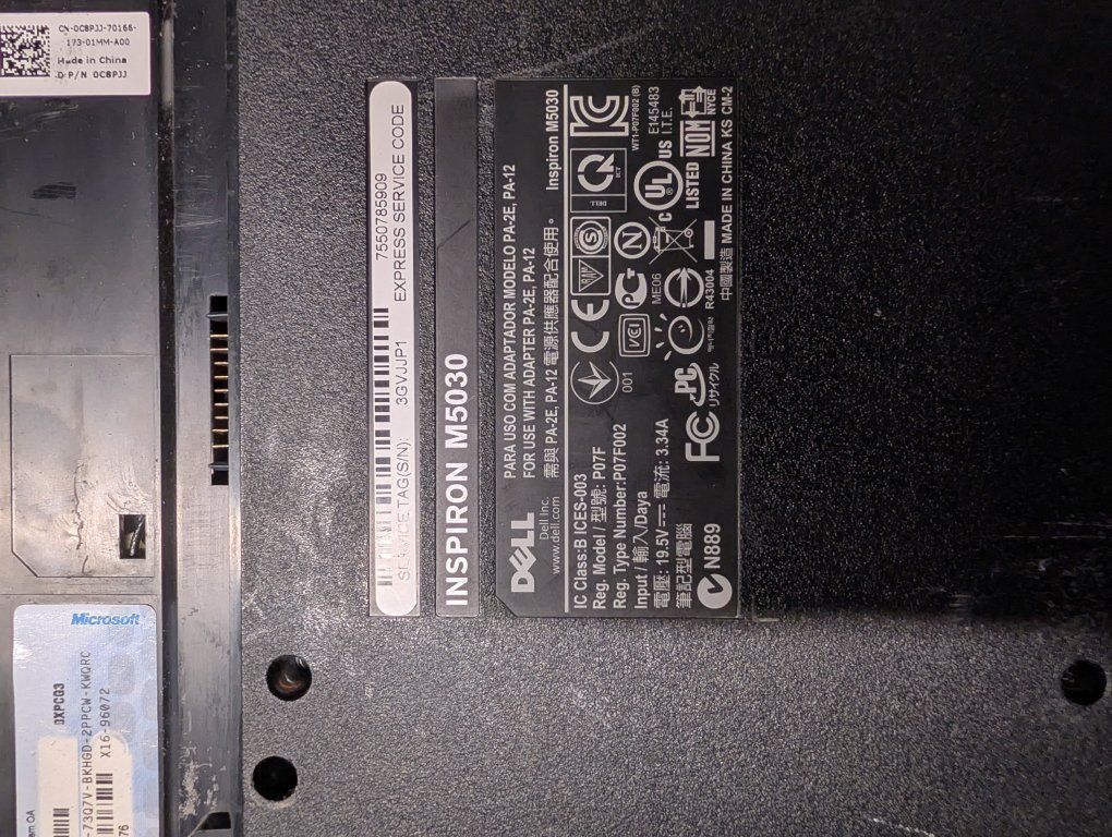 ZelleBrand: Dell Model: Inspiron M5030 Part Number: P07F (Reg Model) Screen Size: 15.6" Technical Status: Power/Testing: Untested. I do not have the required 19.5V 3.34A Dell power adapter to test for power. Battery: Missing. The battery has been removed from the unit. Internal Components: Unknown. Hard drive and RAM status have not been verified. Operating System: Features a genuine Windows 7 Home Prem OA sticker with a visible product key. Condition: For Parts / Not Working. This unit is being sold as-is for repair or parts recovery. Physical Condition: The chassis shows standard signs of wear, including scuffs and scratches on the top and bottom covers. Includes: Laptop unit only. Not Included: Battery, AC Power Adapter, or additional accessories. Note: Sold AS-IS with no returns. Ideal for parts harvesting or a restoration project.