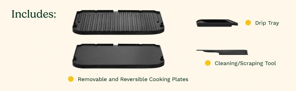 Dishwasher-safe grill/griddle plates, drip tray, and scraping tool make cleanup quick and simple.