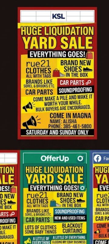 GooglePayEBAY LIQUIDATION EXTRAVAGANZA! Everything must go this Saturday and Sunday right here in Magna! We’re clearing out a massive eBay inventory, featuring a mountain of new and used treasures. From rare finds to everyday essentials, if you can name it, we probably have it—and at prices that will make you double-check the tag. The Details When: Saturday & Sunday (Starting Tomorrow!) Where: Magna, Utah (Follow the bright signs!) What: New-in-box items, vintage collectibles, electronics, and home goods. Don't miss out—once these items are gone, they're gone for good. Whether you're a reseller looking for stock or a neighbor hunting for a steal, show up early to grab the best picks!Massive Liquidation Yard Sale: eBay Overstock & More! Get ready for an absolute treasure hunt! We are clearing out a massive inventory of liquidation, brand-new, and quality used items. Whether you're a reseller looking for eBay-ready stock or just hunting for a deal, there is something for everyone. What’s On The Lot: Tons of rue21 Clothing: Racks upon racks of trendy apparel. We have a huge selection of brand-new-with-tags (NWT) and gently used pieces in various styles and sizes. Car & Automotive Gear: Essential parts and accessories, including oil filters, LED headlight kits, jumper cables, floor mats, and car cleaning kits. Soundproofing & Home Acoustics: High-quality acoustic foam panels, sound-dampening blankets, and weather stripping perfect for home studios or noisy apartments. Blackout Window Solutions: Keep the light out and the cool in with various blackout curtains, thermal liners, and suction-cup window covers.