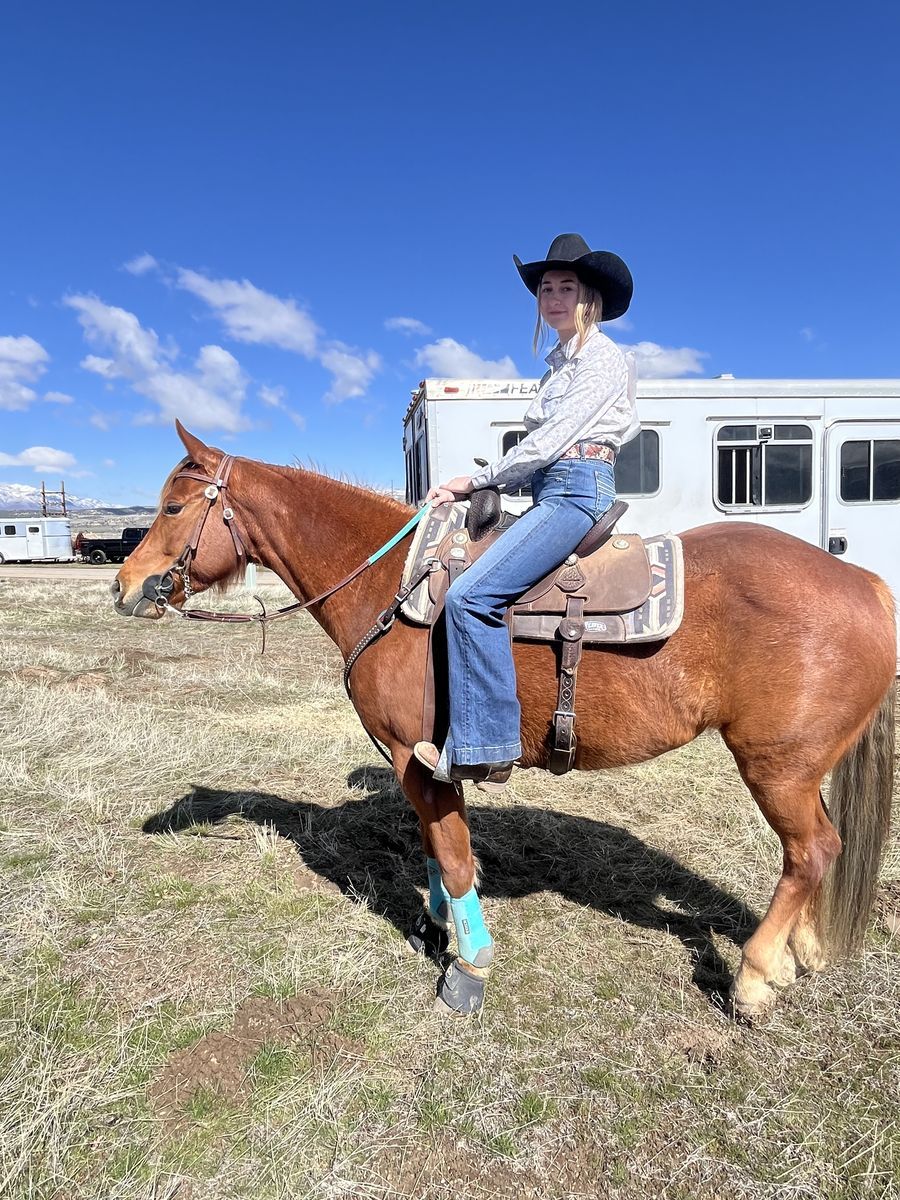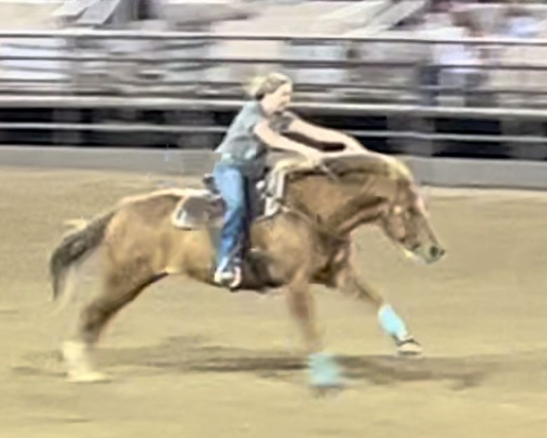 Fern needs a calm and confident rider that is soft with their hands and cool in the seat. Our daughter has trained and ridden for many years, just not western. Fern is a FREE RUNNER! Fern is not a kids horse. She is fast and can easily get emotional if you amp her up. She is not a kick ride until the home stretch; she knows her job. She's faster when she is focused. You ride her hot and blow her up and she will blow past every barrel. She prefers to swap leads at the second barrel when you ask her to rate and change bend versus expecting a lead change exiting the first barrel. She has never offer a buck, spook or bolt. She's just fast.