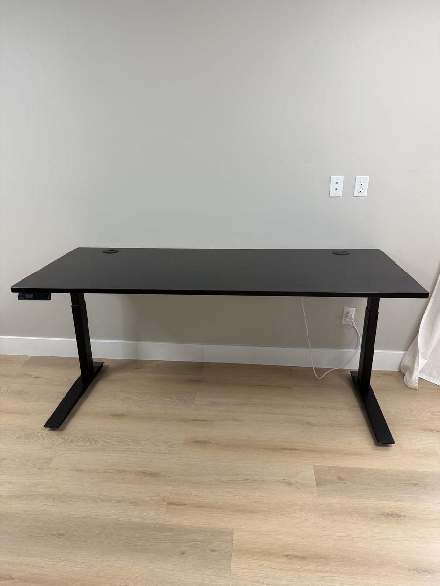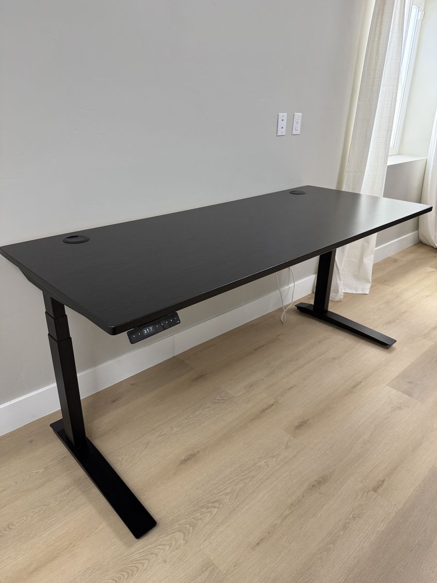 VenmoJarvis sit-stand desk with beautiful bamboo top (72" x 30"). Includes programmable handset for saving your preferred height presets and standard grommets for clean cable routing. Smooth, quiet electric height adjustment.