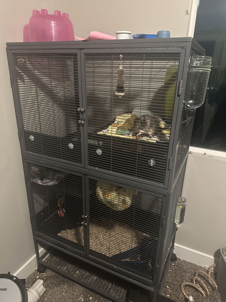 ApplePay4 pet rats, all male, with the enclosure and whatever accessories and supplies we have. We have some food, a bunch of enclosure accessories, a bunch of fabric cozy sacks and hammocks, 2 water bottles, extra bedding, food bowl, chew toys, carry cage, and such.