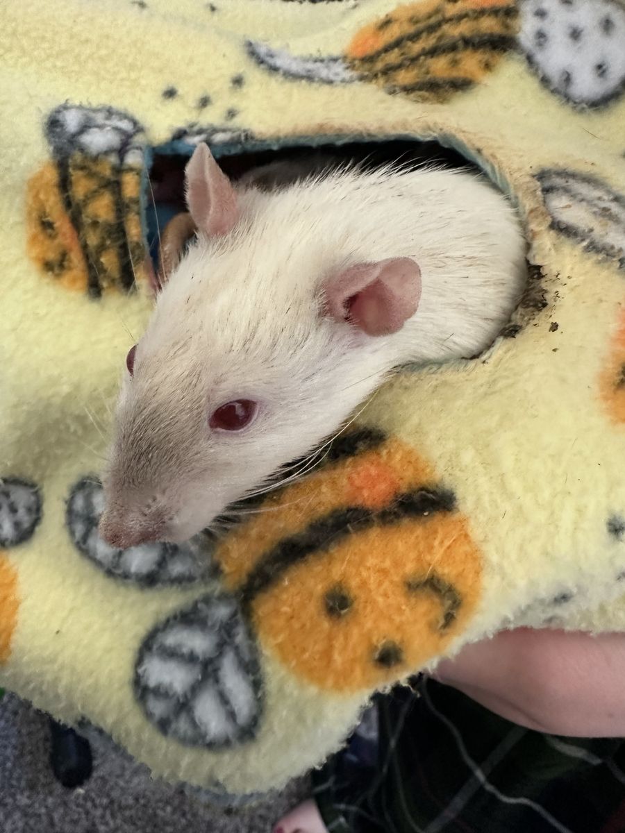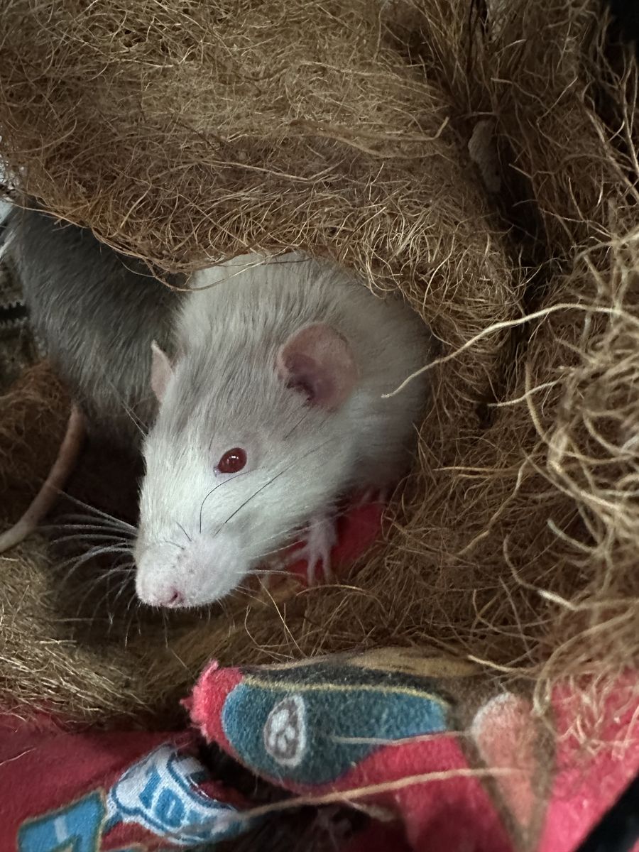 Rats are friendly and in good health, maybe 6 months old. They've all been together since they were very young. The two albino don't see as well, but the other two look after them.