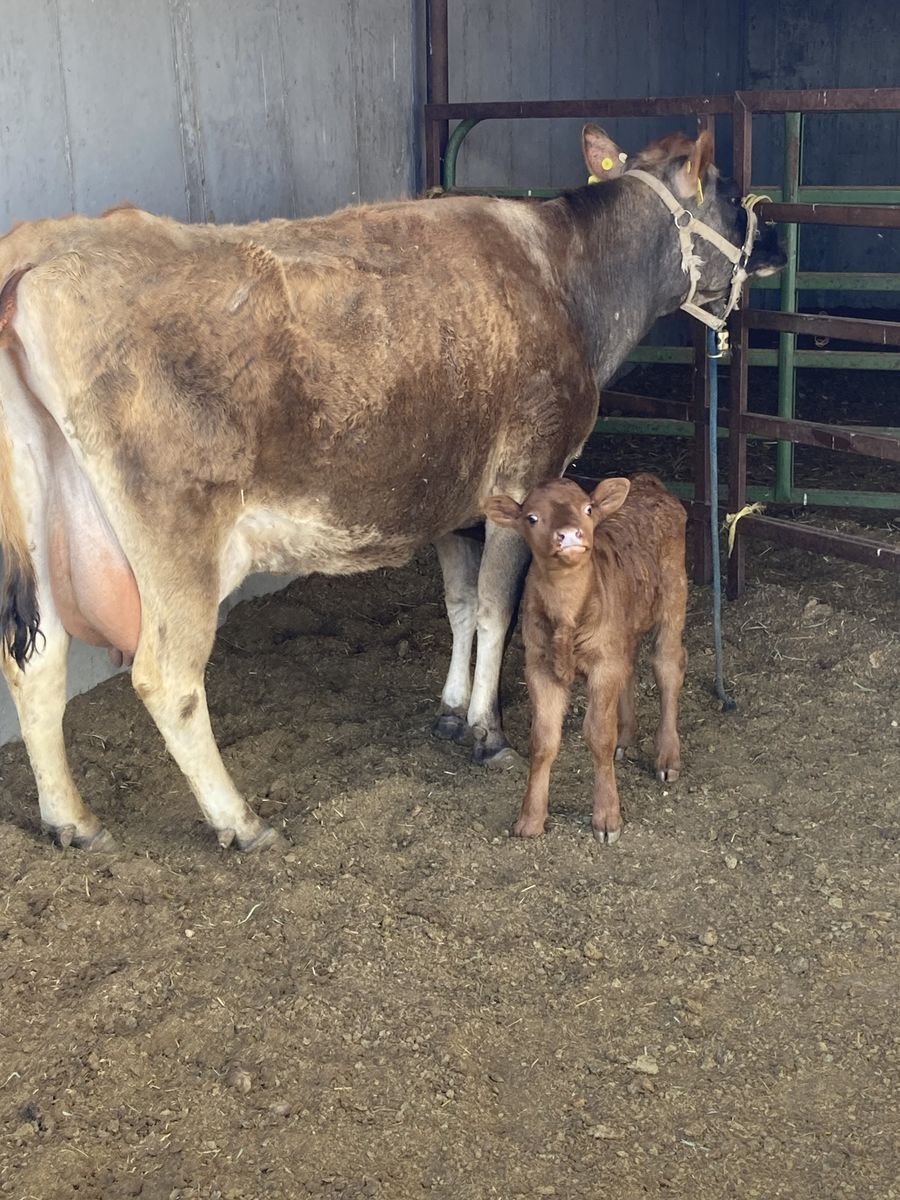 6 Yr old jersey. Broke to lead. Good On all 4 quarters. Has red angus heifer twin calf drafted on. Takes calves easily. Calves 2-2-2026. Call for info. 435-823-7015