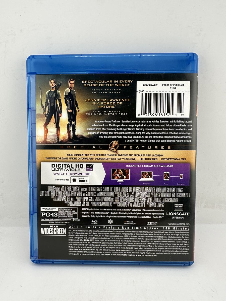 ApplePayOwn The Hunger Games: Catching Fire on Blu-ray + DVD + Digital HD. Starring Jennifer Lawrence, this action-packed sequel delivers stunning visuals and bonus features. Includes original case and disc in good condition.