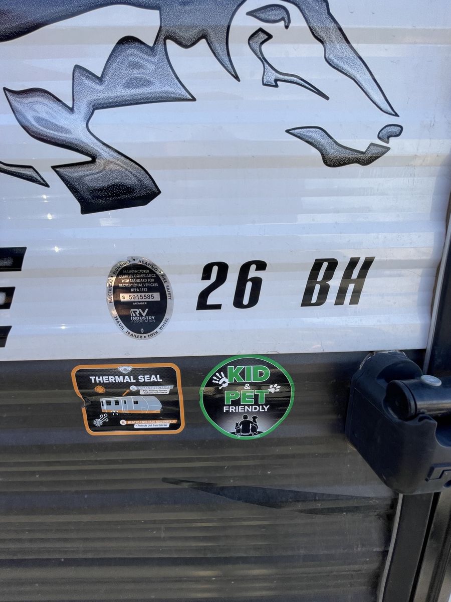 We are looking to sell our trailer as we recently got a side by side and now need a toy hauler. It’s has been an amazing camp trailer for our family. The kids love the bunk beds and it is basically brand new inside and out. Very light trailer only weighs 4,800 pounds, 26 feet of living space and an overall length of 29 feet. This trailer tows very well. Everything works as it should AC, furnace, and all appliances. No leaks in any of the plumbing, walls or roof. It has a very large, power retracting awning with LED lights and Bluetooth speakers. Awning has no rips or tears. Power jack, large pass through storage on the front. Full walk around queen size bed. Tires are in great shape, batteries are in good shape. Feel free to reach out with any questions.