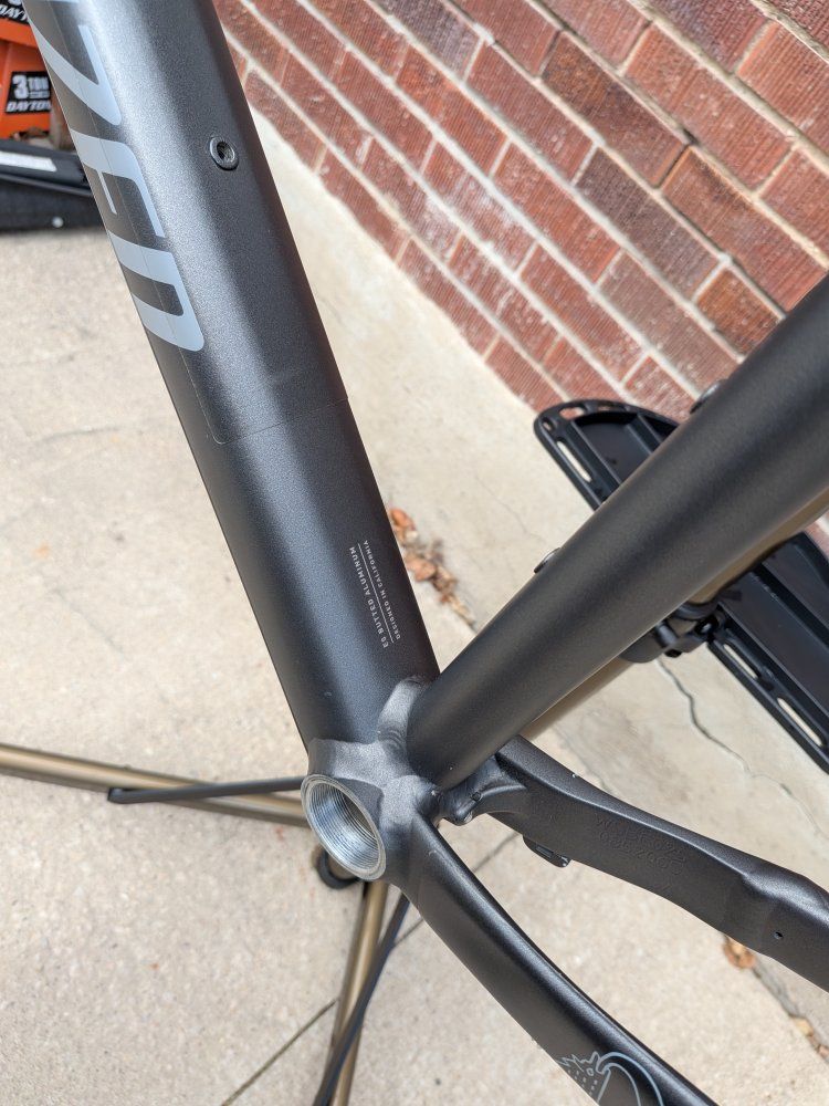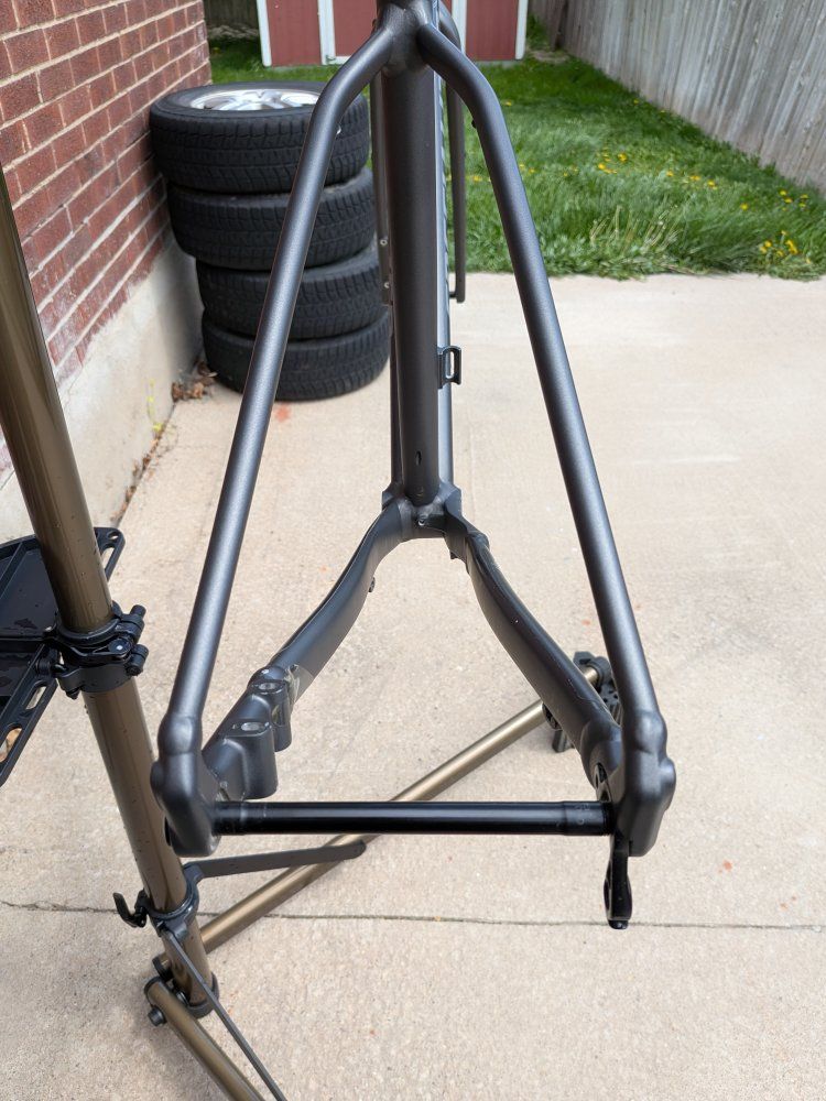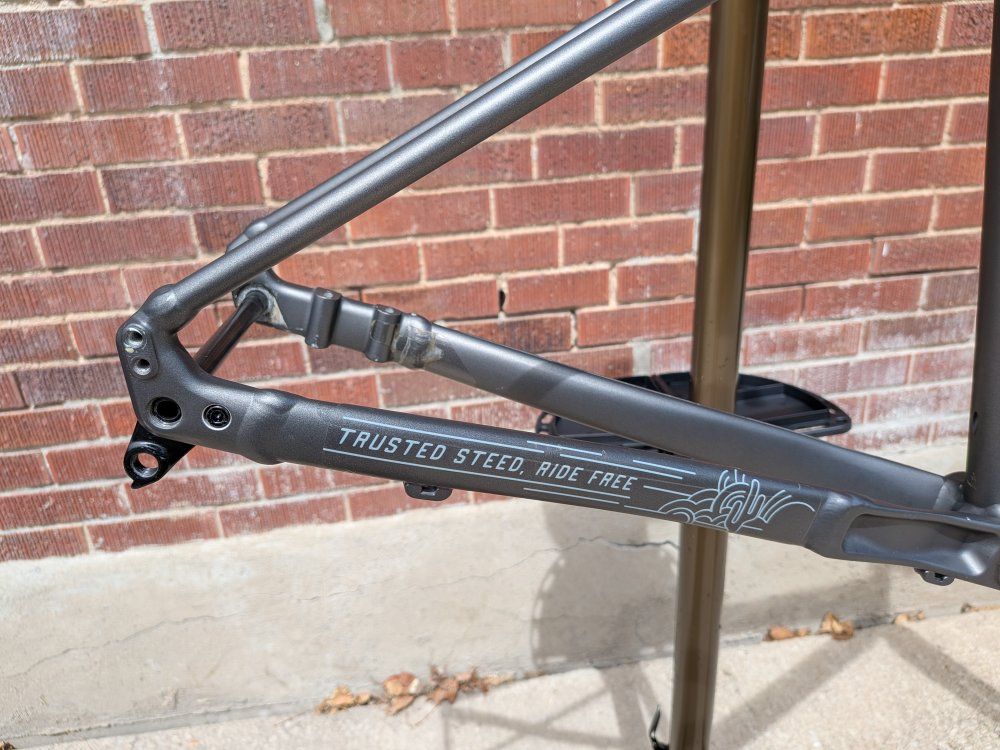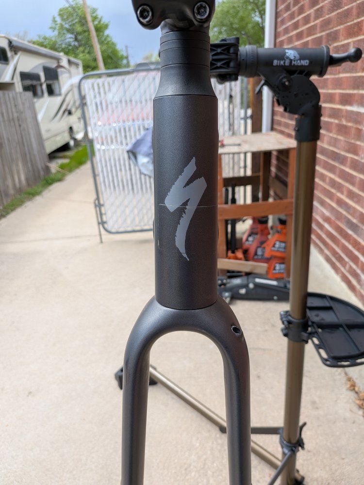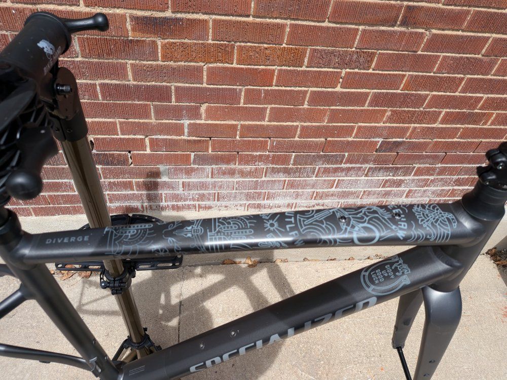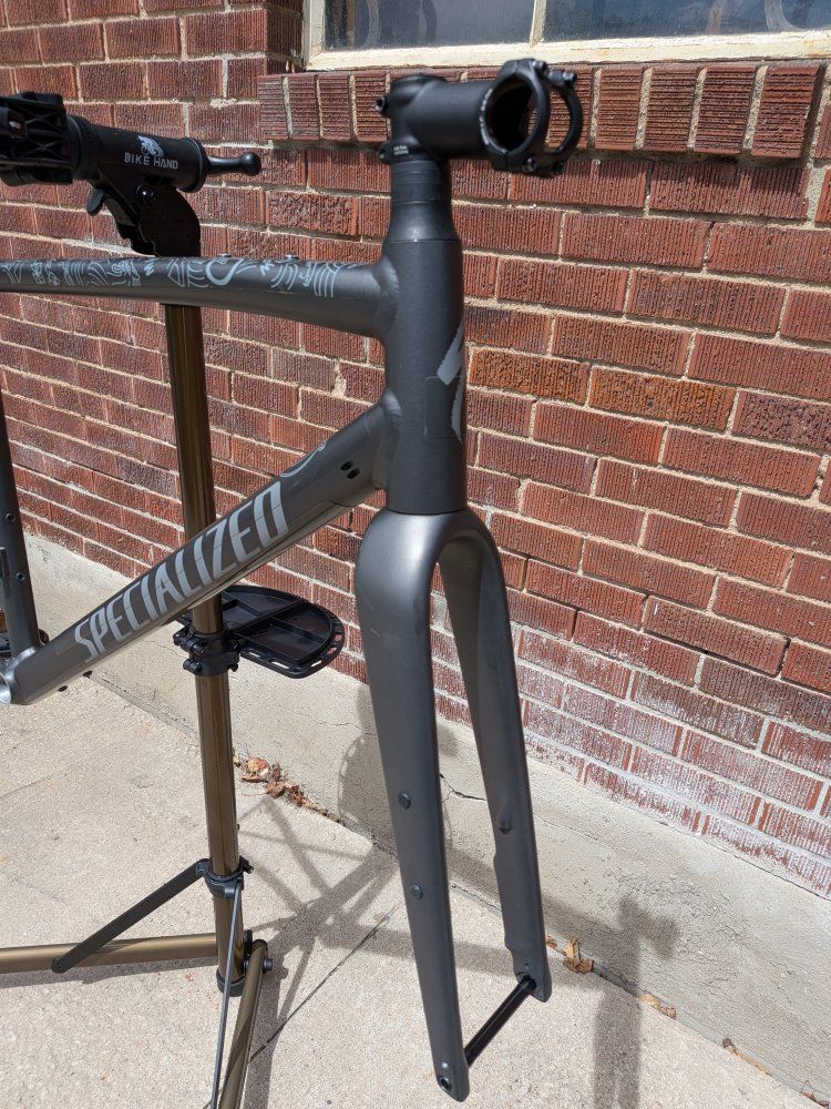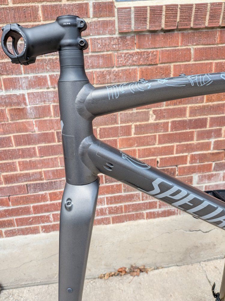 Specialized Diverge E5 frameset, size 54. Aluminum alloy frame, carbon fork. Includes thru-axles and 80mm stem. Excellent condition, some very very minor wear marks here and there. GroundKeeper frame protector sheets on the top tube, down tube, and chain stays.
