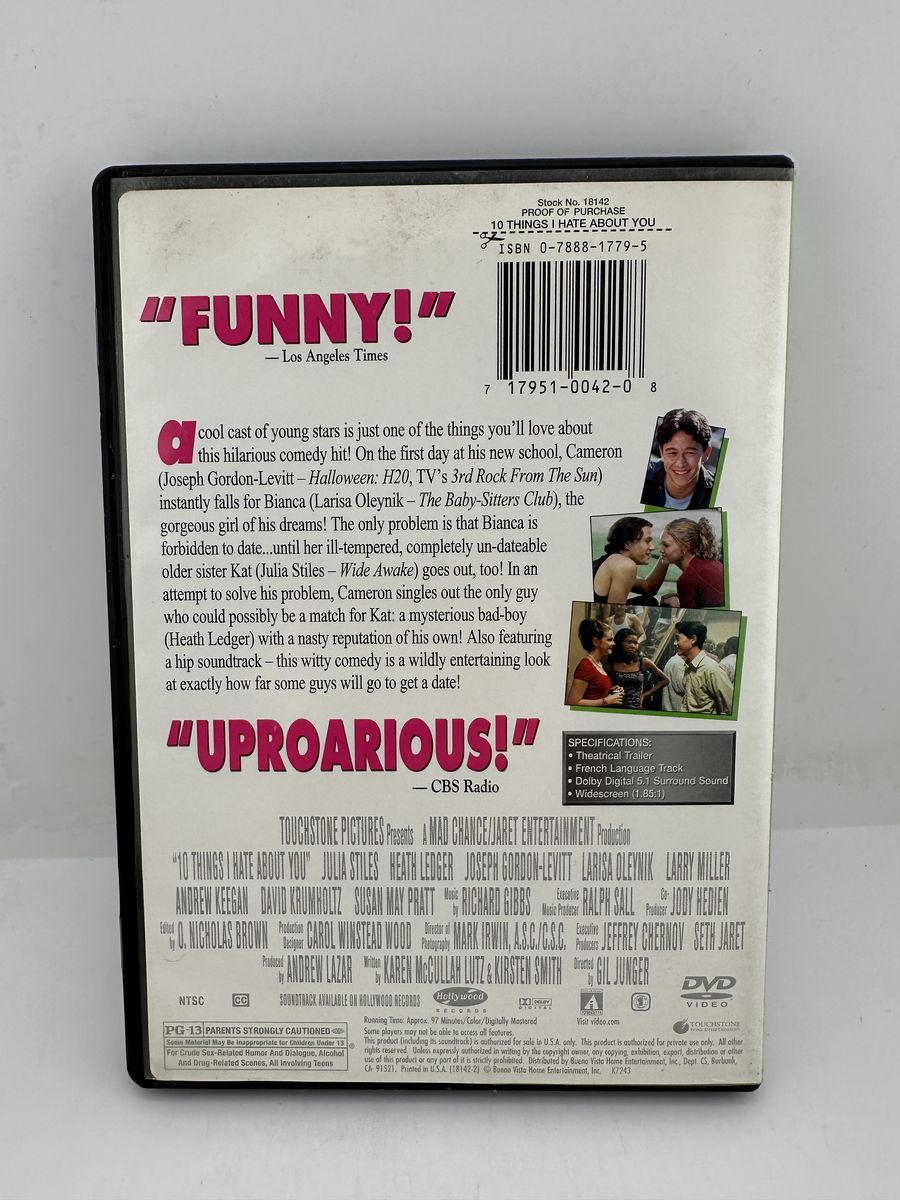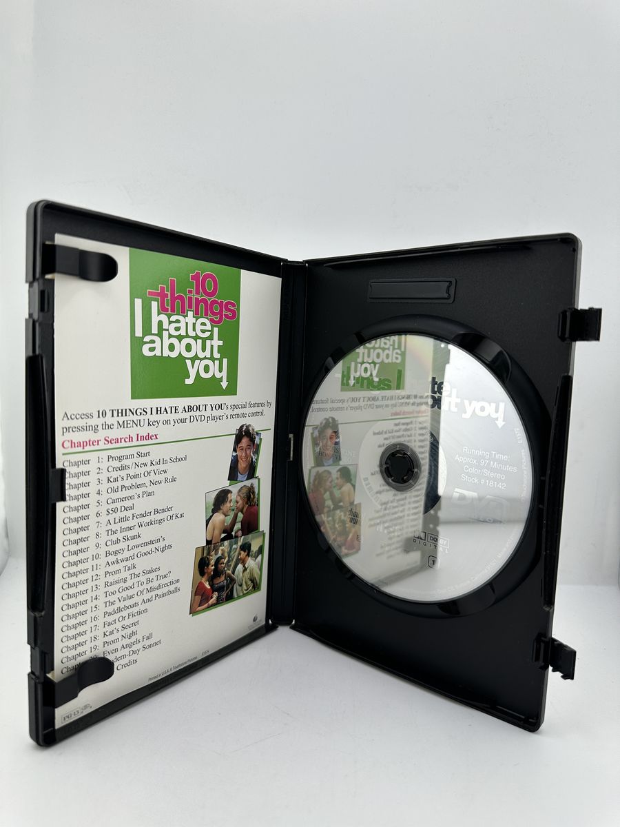 ApplePayWatch 10 Things I Hate About You on DVD, a classic teen romantic comedy starring Heath Ledger and Julia Stiles. Includes original case and artwork. Disc in good condition with light wear.
