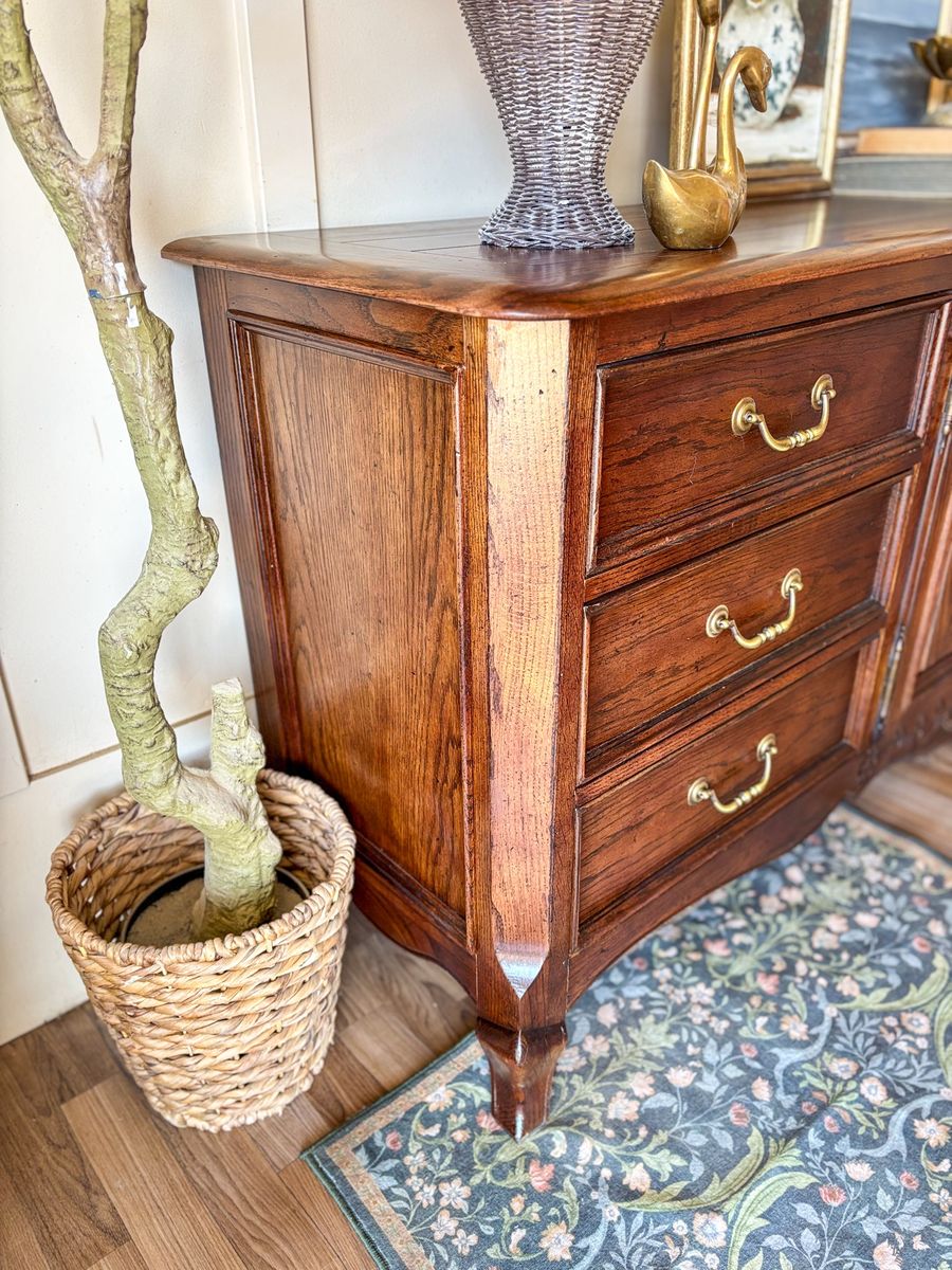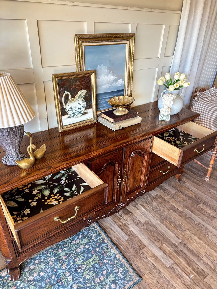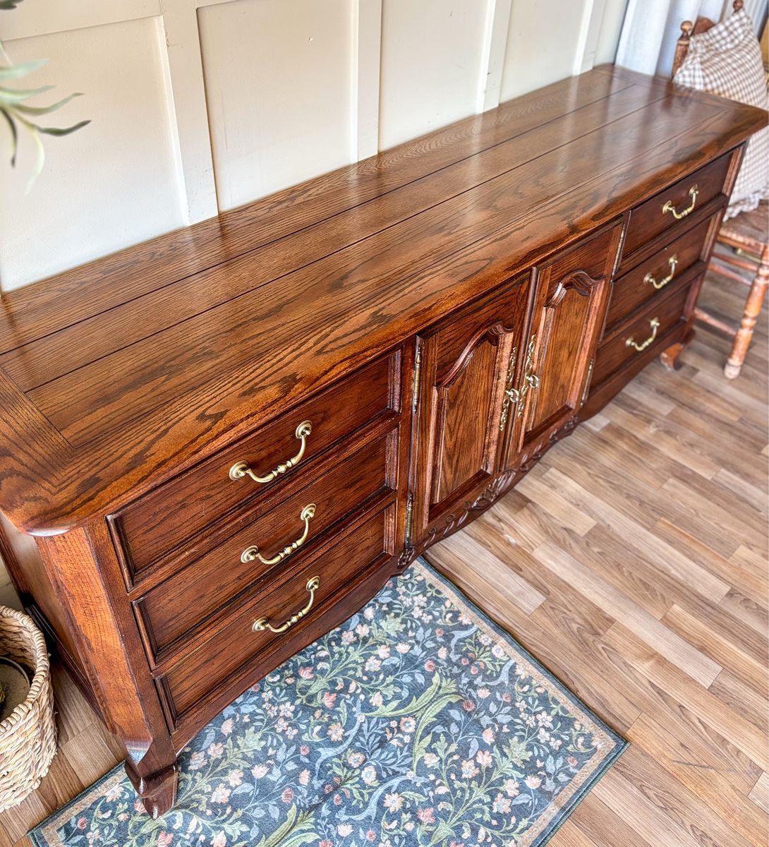 VenmoThis vintage French provincial solid oak dresser is full of charm and unique detail. The top has been refinished and sealed with lacquer, giving it a refreshed look while the body remains in its original vintage condition with light wear. It features original brass hardware and beautifully styled drawer fronts along with a distinctive slatted panel look across the top that really sets it apart. The top drawers have been lined with wallpaper for an added custom touch. All drawers and cabinet doors open and close with ease on wood slides and dovetail construction, making this piece both elegant and practical!