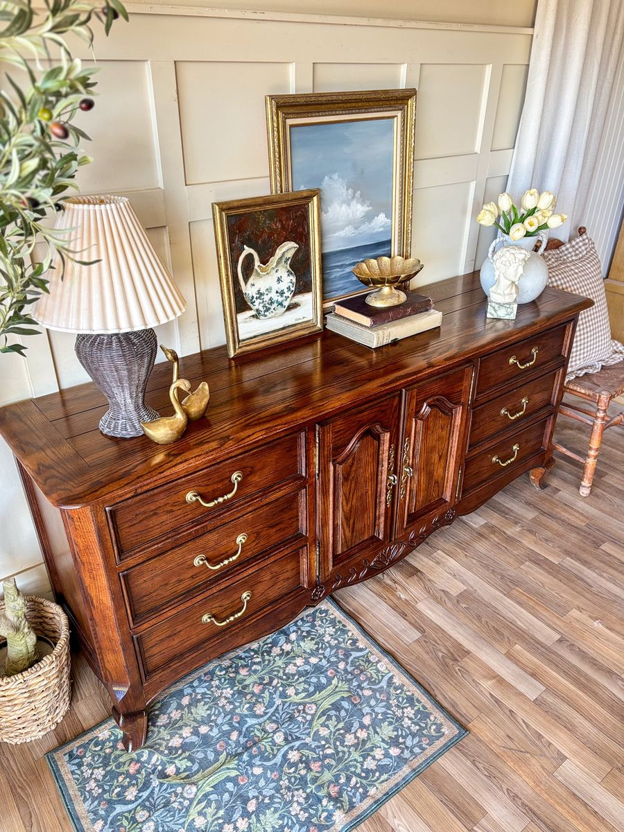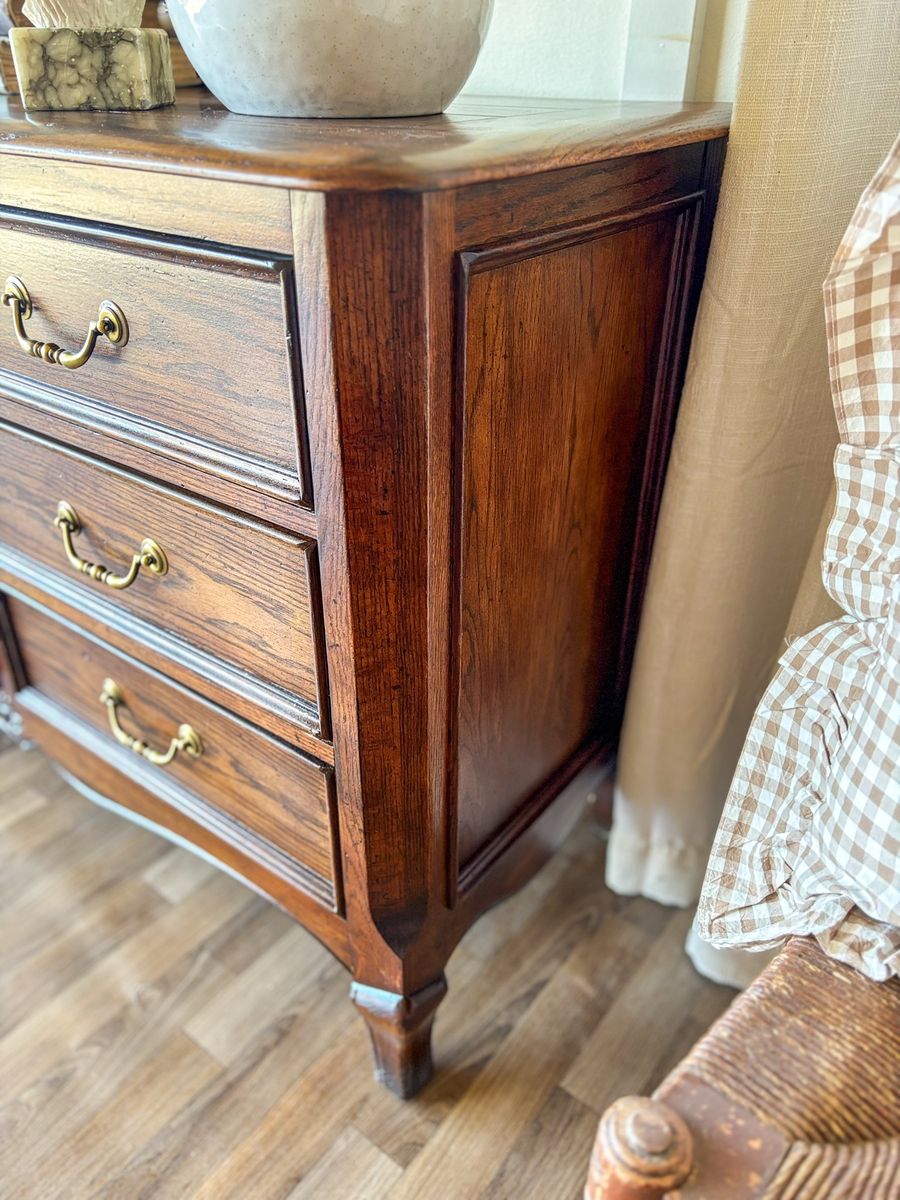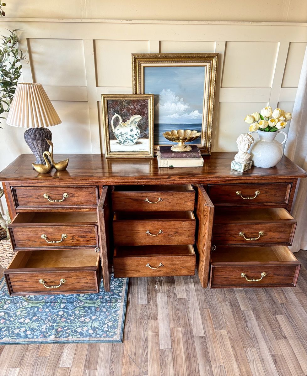 VenmoThis vintage French provincial solid oak dresser is full of charm and unique detail. The top has been refinished and sealed with lacquer, giving it a refreshed look while the body remains in its original vintage condition with light wear. It features original brass hardware and beautifully styled drawer fronts along with a distinctive slatted panel look across the top that really sets it apart. The top drawers have been lined with wallpaper for an added custom touch. All drawers and cabinet doors open and close with ease on wood slides and dovetail construction, making this piece both elegant and practical!