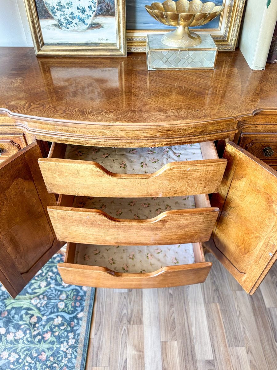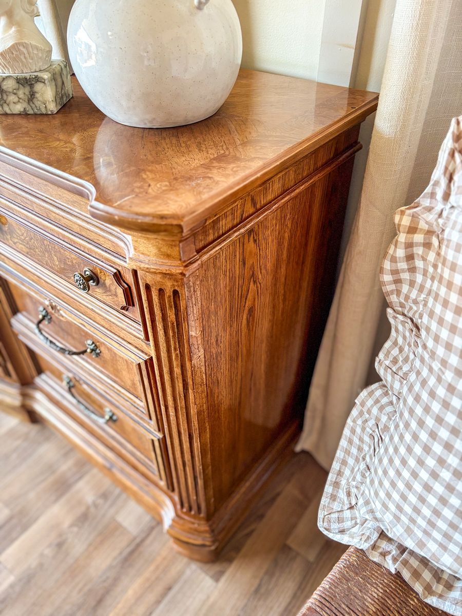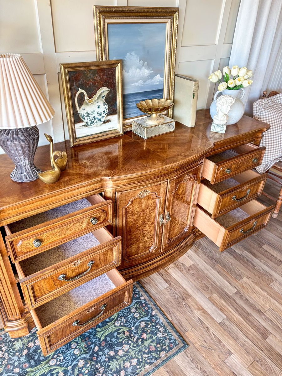 VenmoThis solid wood Burl front dresser has a beautiful traditional feel with strong French and classic influences. The curved front gives it a soft elegant shape while the detailed woodwork really sets it apart. It features original brass hardware and all drawers and doors open and close with ease. The craftsmanship on this piece is incredible with a checkered wood pattern across the top and stunning burl wood inlay on the drawer fronts that catches the light in the best way. It remains in original vintage condition with light wear, making it a perfect piece for anyone who appreciates unique woodwork and timeless design!