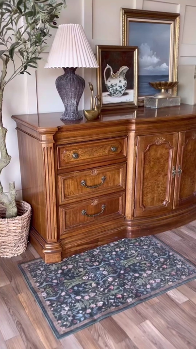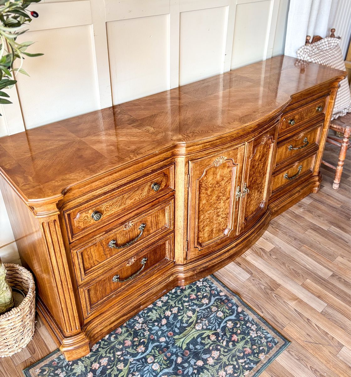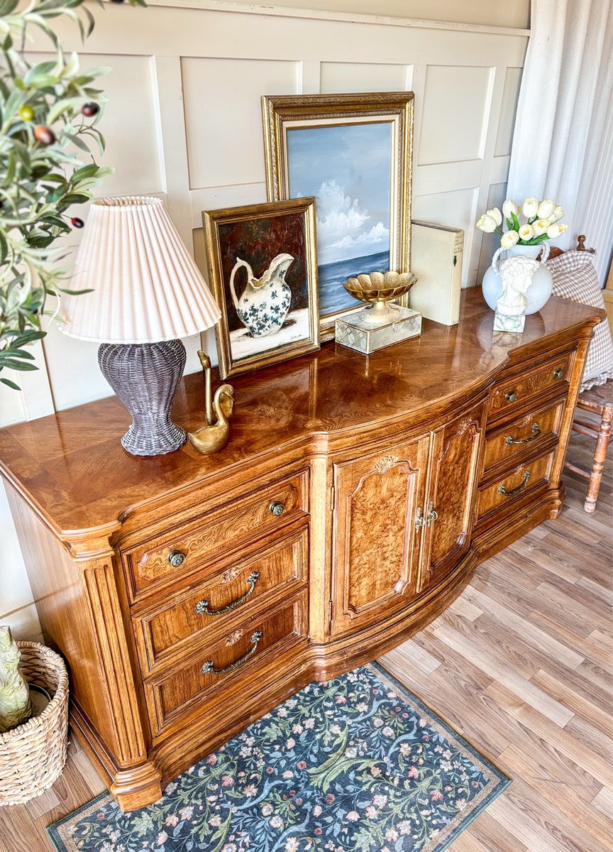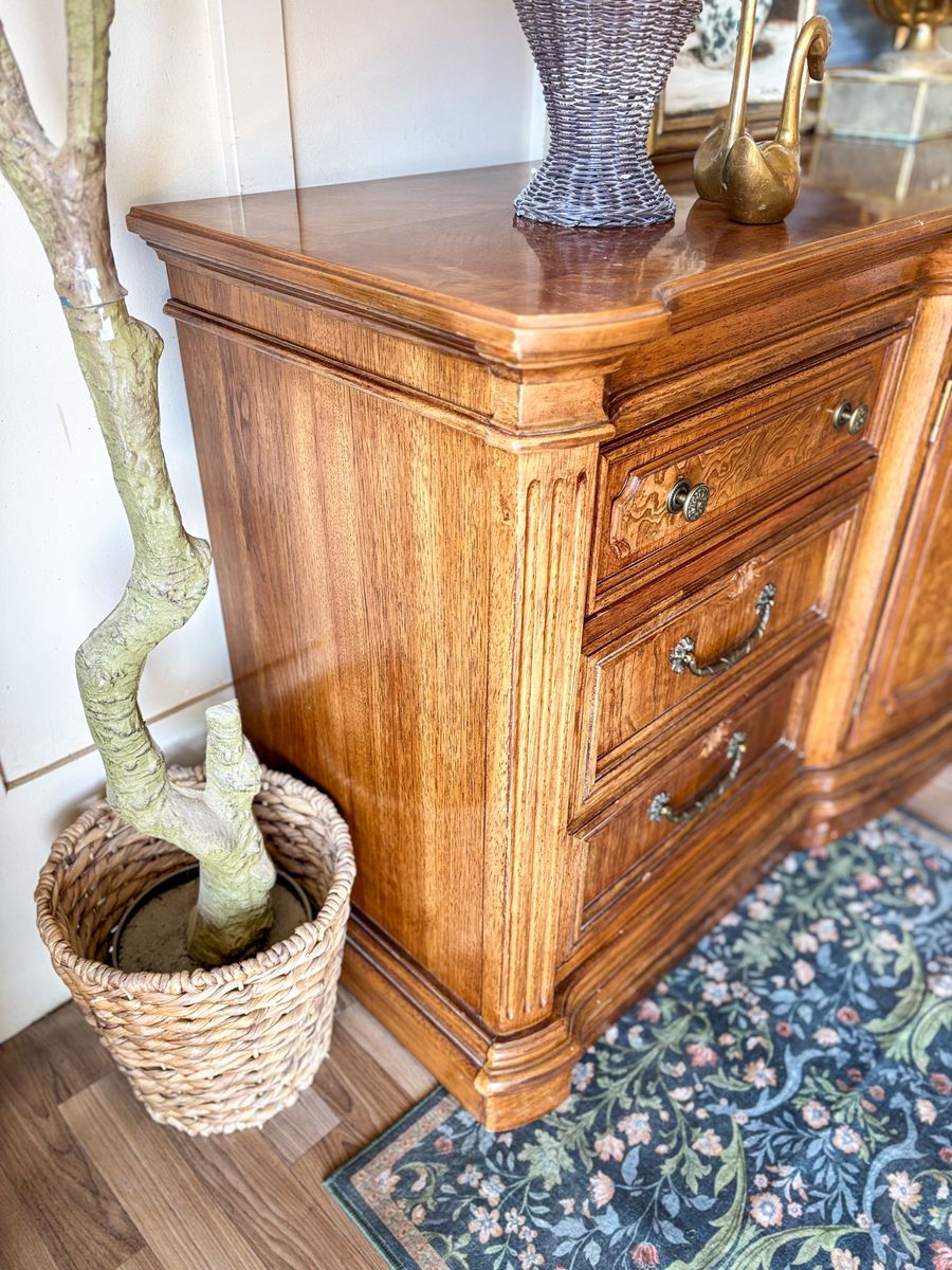 VenmoThis solid wood Burl front dresser has a beautiful traditional feel with strong French and classic influences. The curved front gives it a soft elegant shape while the detailed woodwork really sets it apart. It features original brass hardware and all drawers and doors open and close with ease. The craftsmanship on this piece is incredible with a checkered wood pattern across the top and stunning burl wood inlay on the drawer fronts that catches the light in the best way. It remains in original vintage condition with light wear, making it a perfect piece for anyone who appreciates unique woodwork and timeless design!