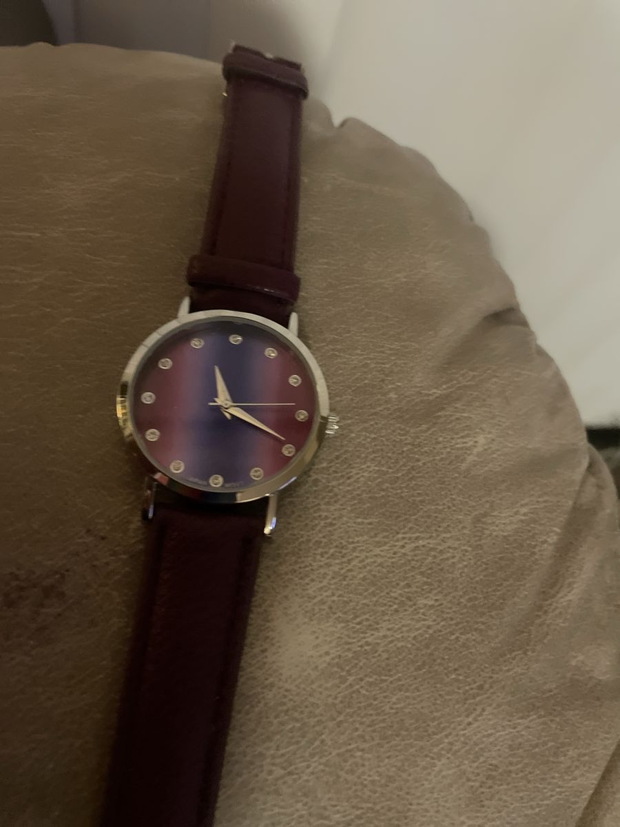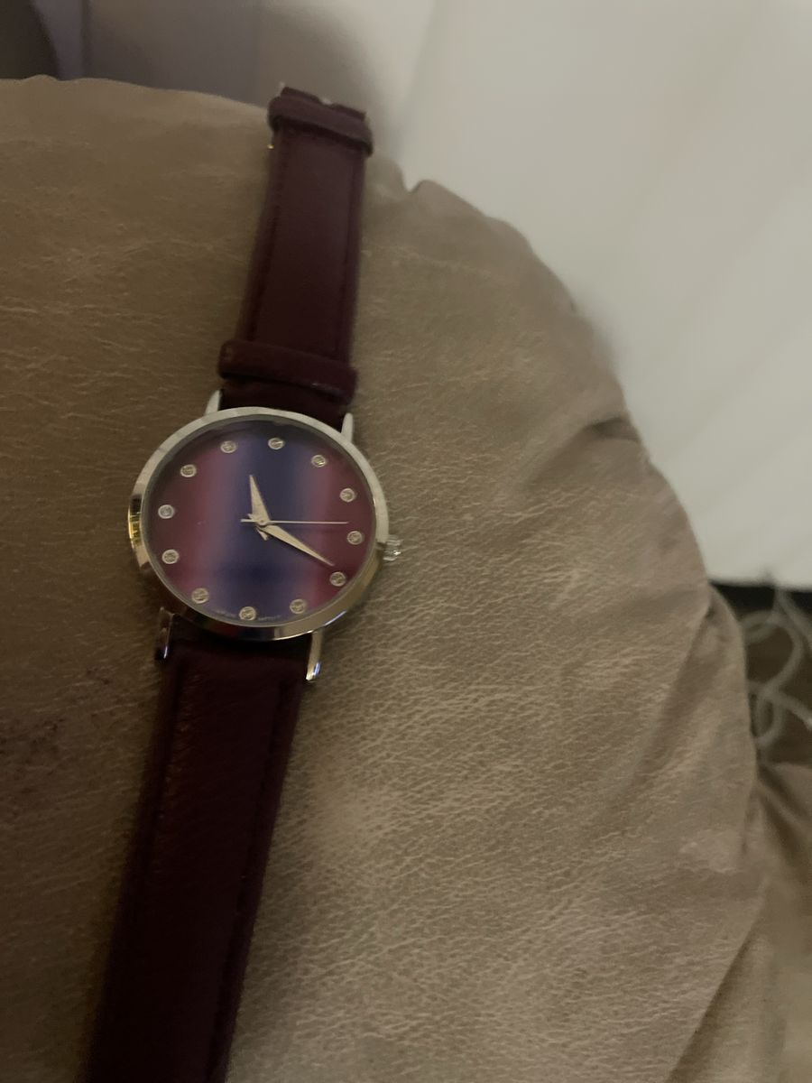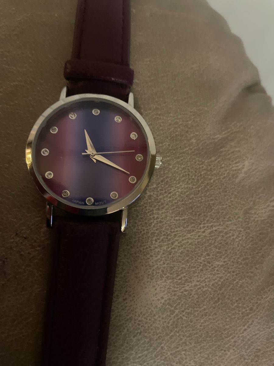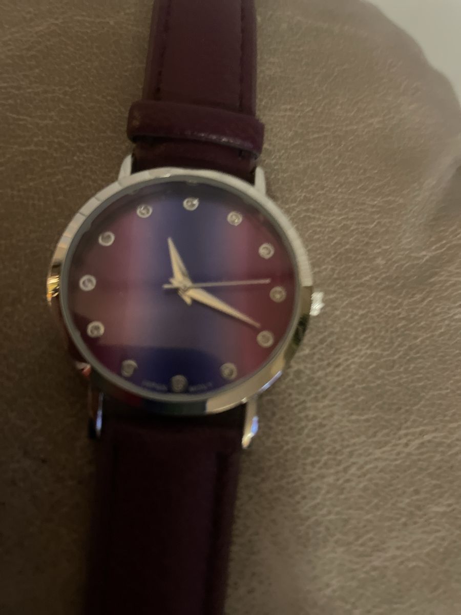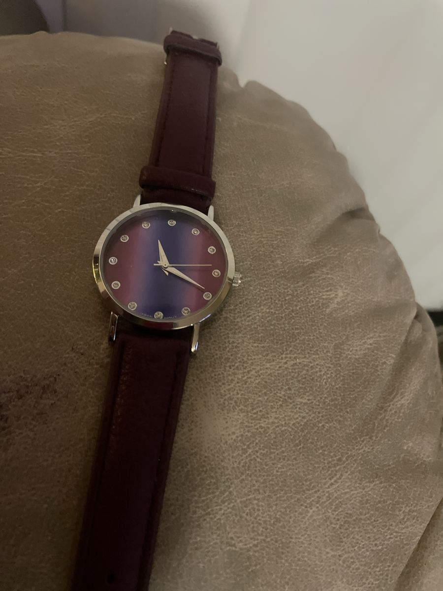 Featuring a silver toned case. With a purple gradient dial. And a burgundy leather strap.