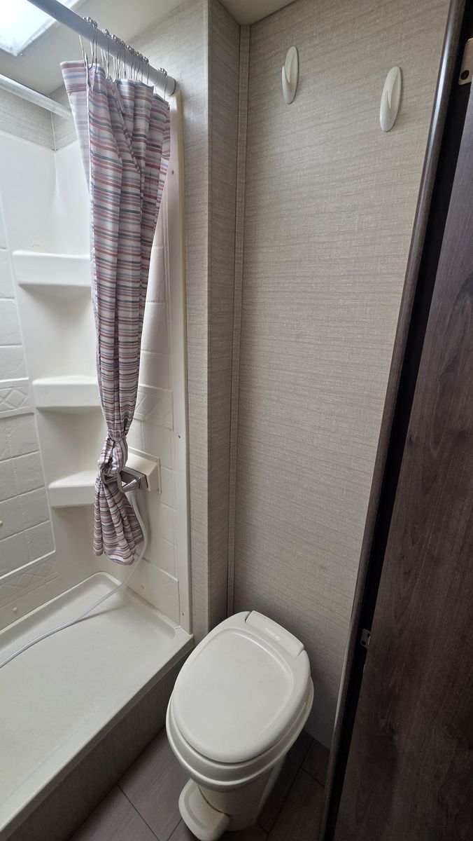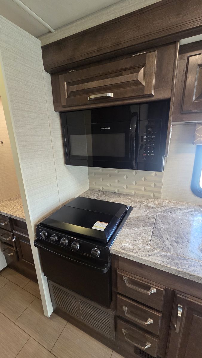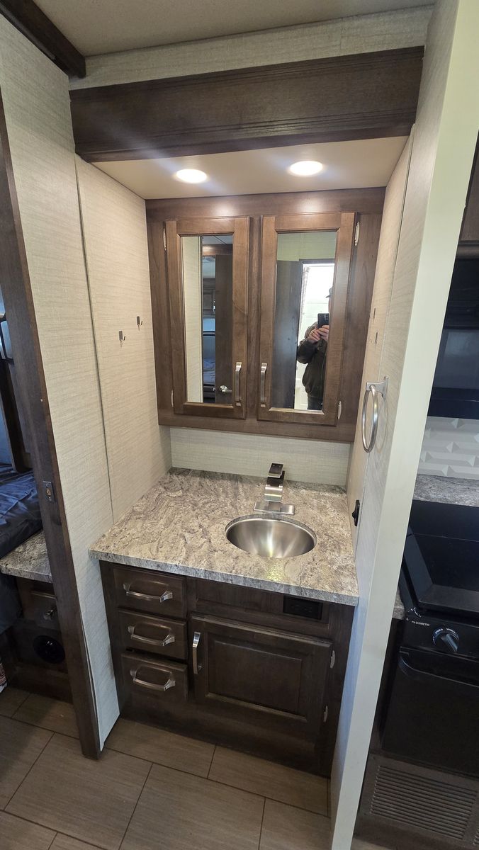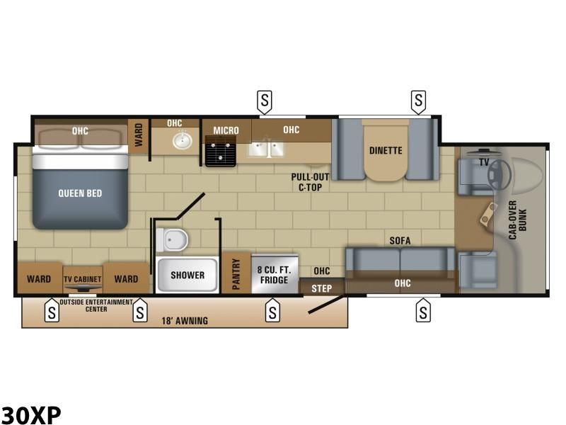 The 30XP floorplan features one full-wall slide-out, creating a wide open living area with a private rear bedroom. Sleeps 8.