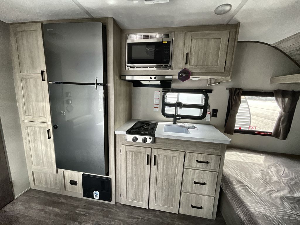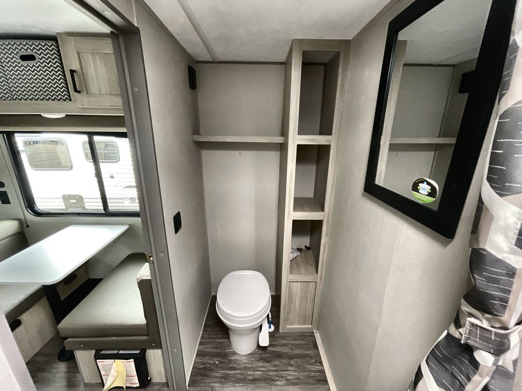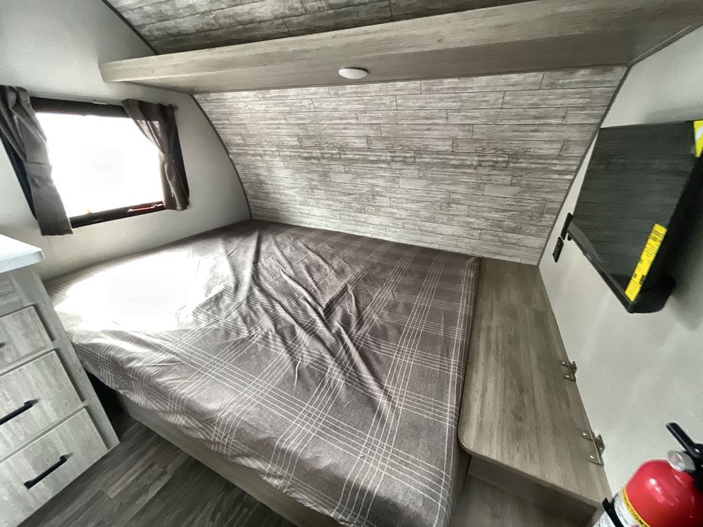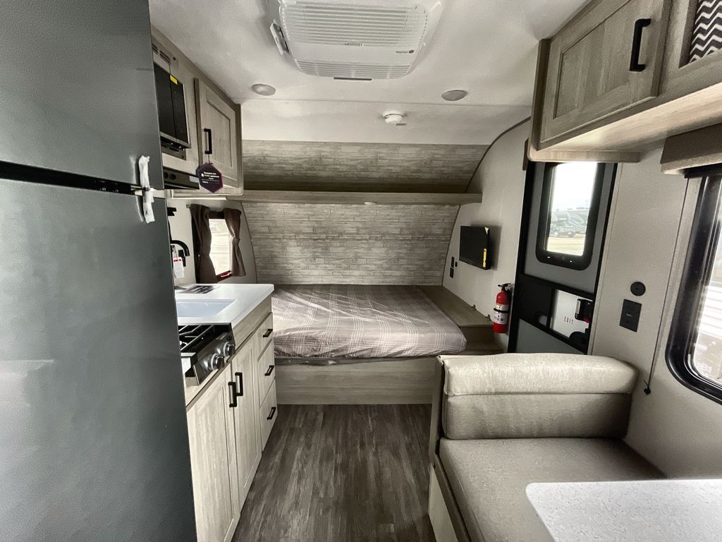 This cozy couples trailer with a queen bed is the perfect travel companion! You will have a queen bed up front to sleep on each night. The booth dinette**,** just to the left of the entry door, is a great place to enjoy meal and your morning cup of coffee! Use the two burner cooktop and microwave oven to create camp meals inside. This model includes plenty of storage space, including a large overhead in front, nightstands on either side of the sofa, a pantry for dry goods and snacks, and a linen cabinet in the rear bath that also offers a 36" x 30" shower, toilet and shelf for towels and such. There is even storage beneath the bar top as well.