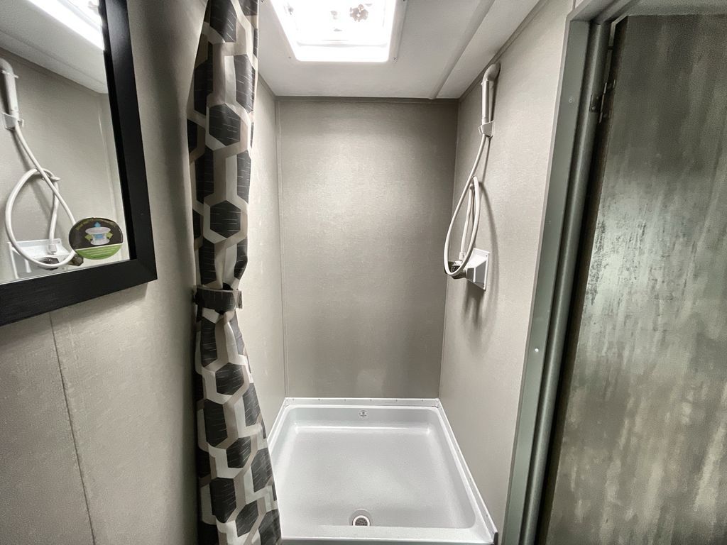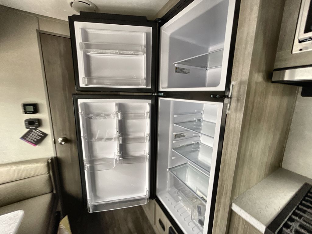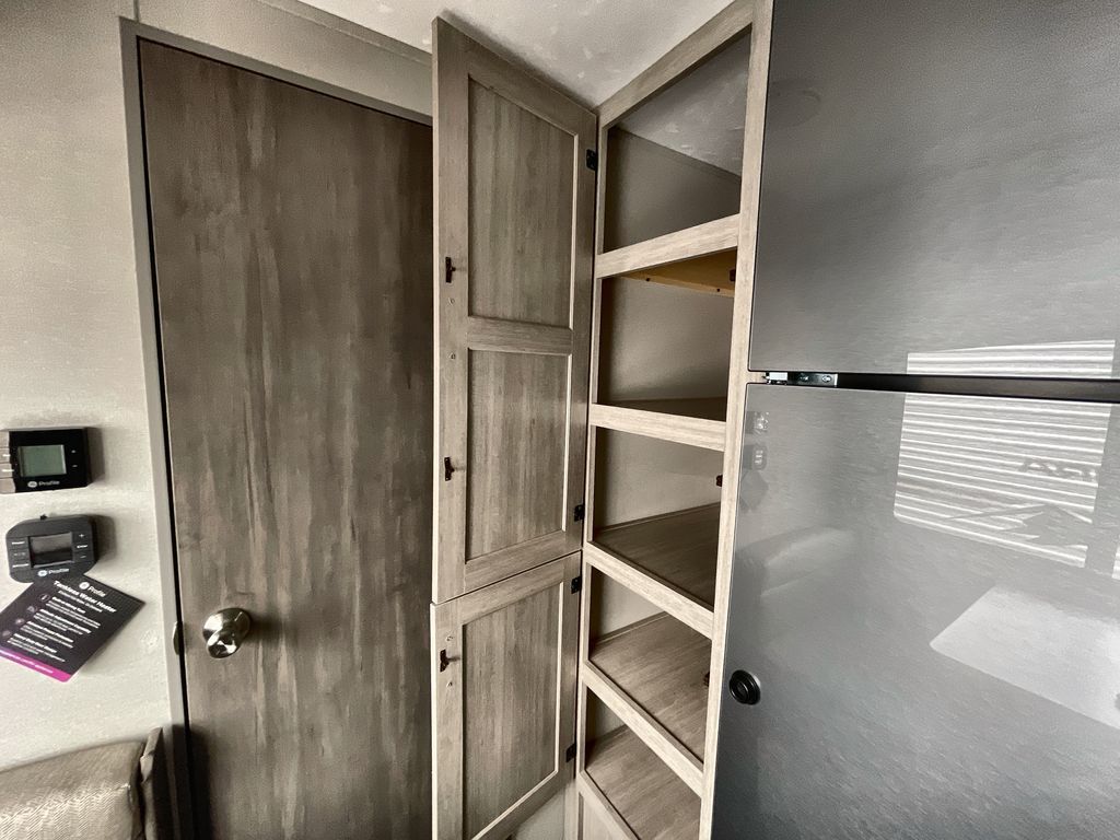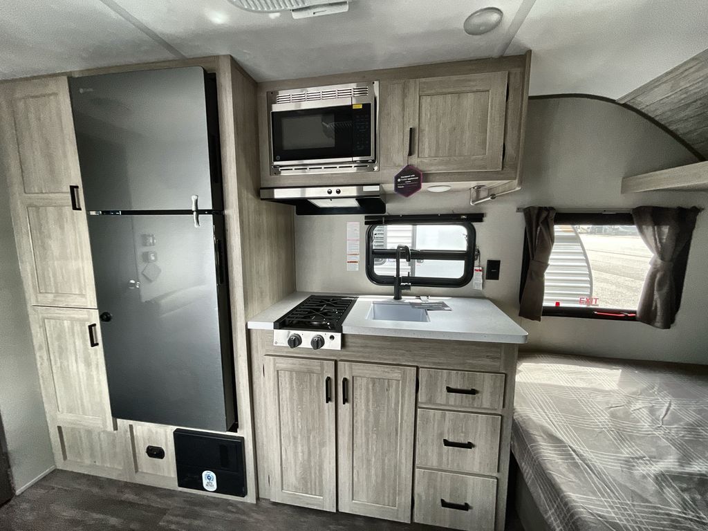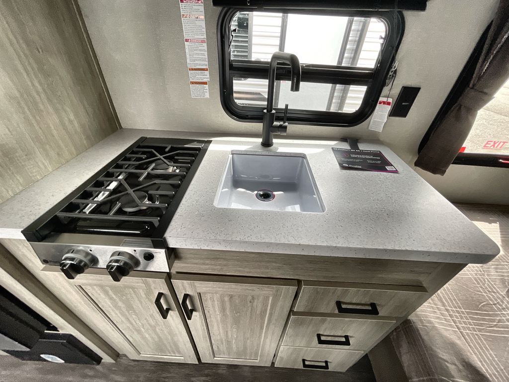 This cozy couples trailer with a queen bed is the perfect travel companion! You will have a queen bed up front to sleep on each night. The booth dinette**,** just to the left of the entry door, is a great place to enjoy meal and your morning cup of coffee! Use the two burner cooktop and microwave oven to create camp meals inside. This model includes plenty of storage space, including a large overhead in front, nightstands on either side of the sofa, a pantry for dry goods and snacks, and a linen cabinet in the rear bath that also offers a 36" x 30" shower, toilet and shelf for towels and such. There is even storage beneath the bar top as well.