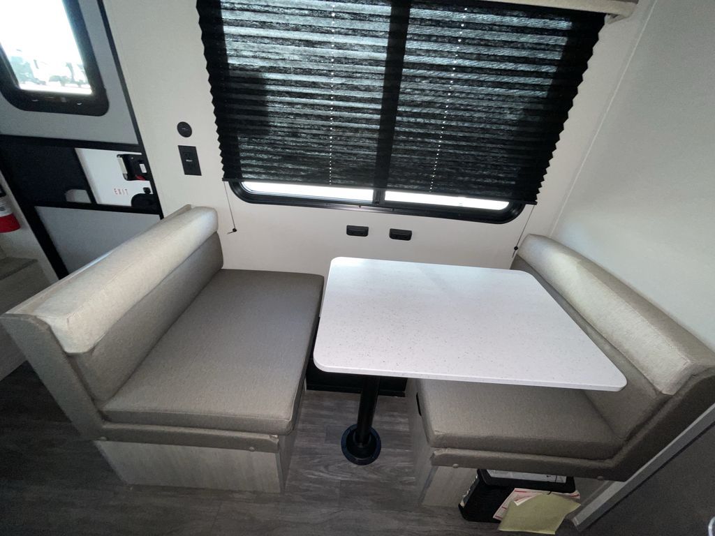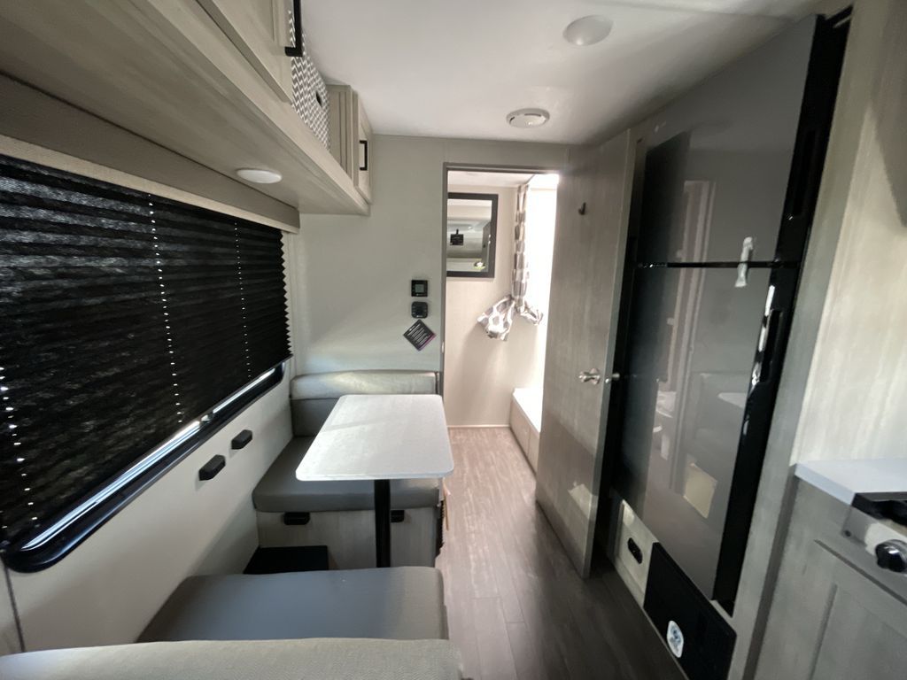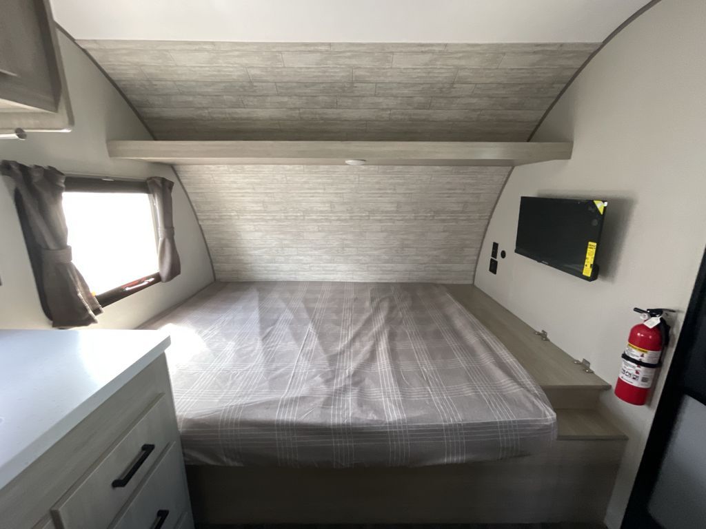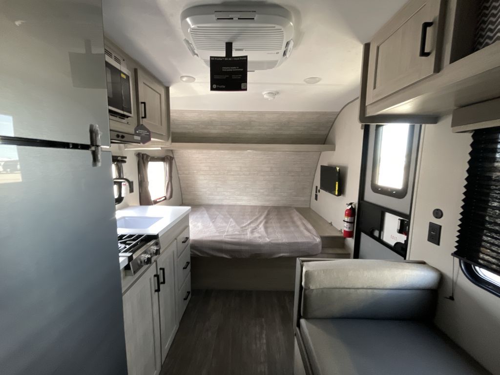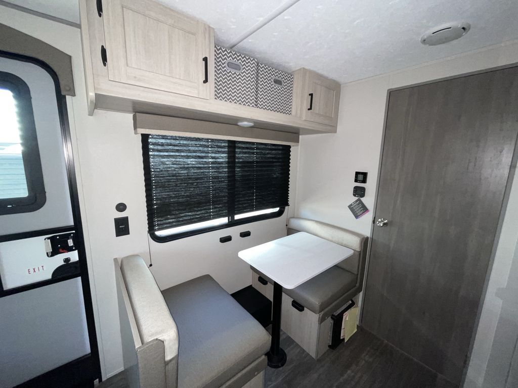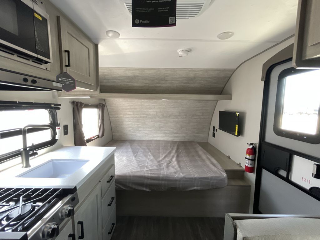 This cozy couples trailer with a queen bed is the perfect travel companion! You will have a queen bed up front to sleep on each night. The booth dinette**,** just to the left of the entry door, is a great place to enjoy meal and your morning cup of coffee! Use the two burner cooktop and microwave oven to create camp meals inside. This model includes plenty of storage space, including a large overhead in front, nightstands on either side of the sofa, a pantry for dry goods and snacks, and a linen cabinet in the rear bath that also offers a 36" x 30" shower, toilet and shelf for towels and such. There is even storage beneath the bar top as well.