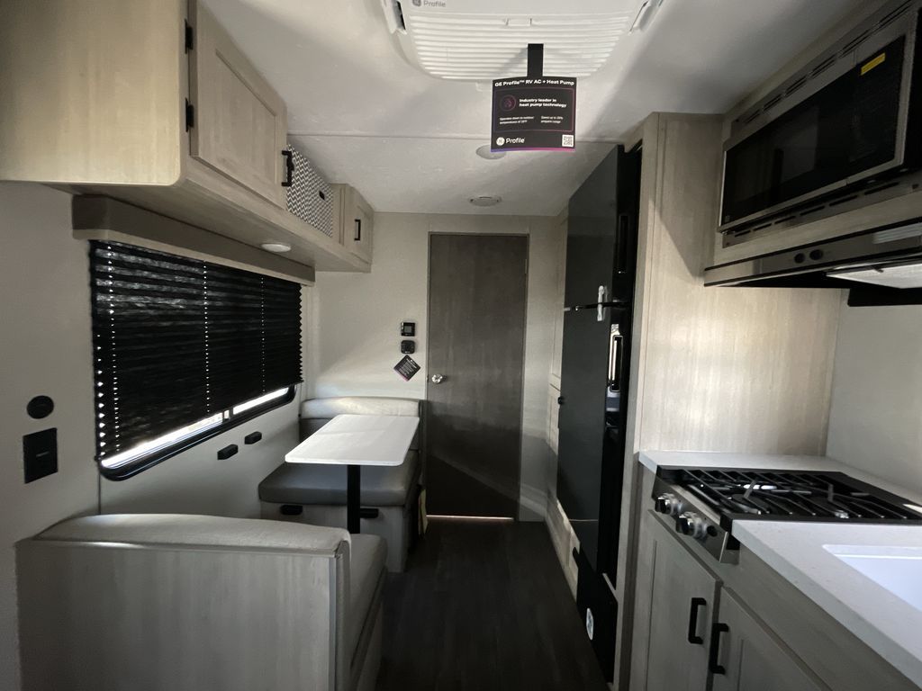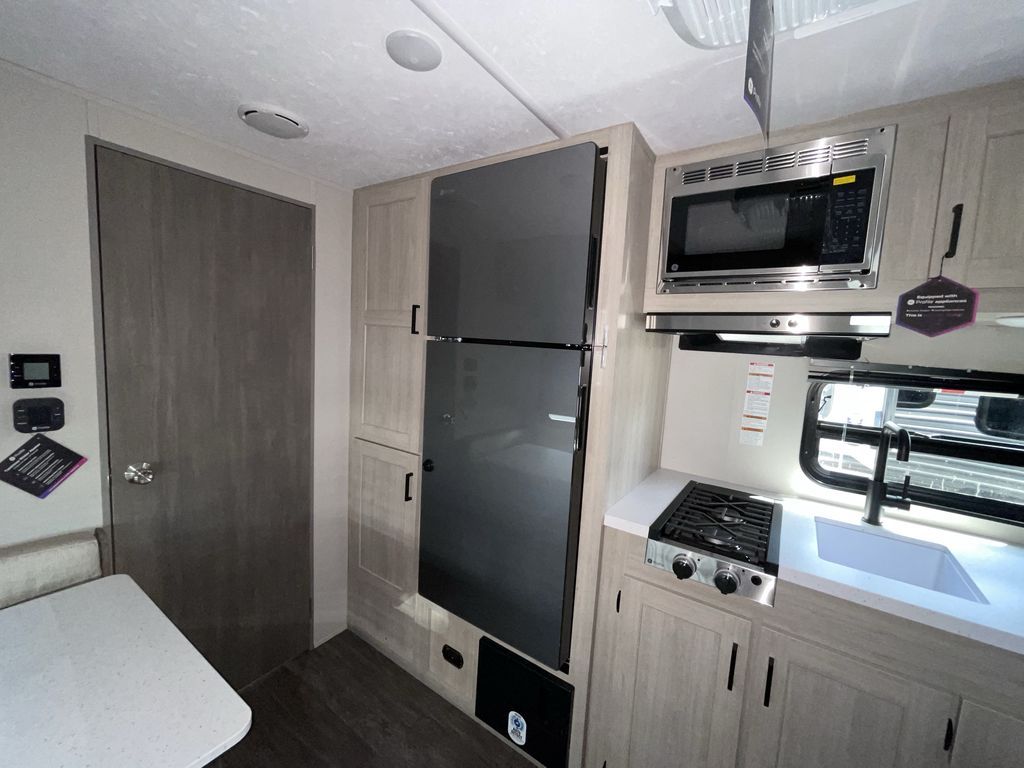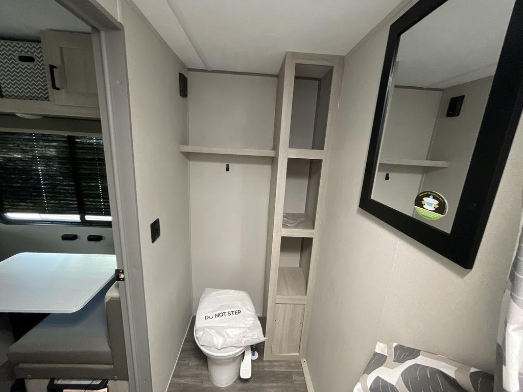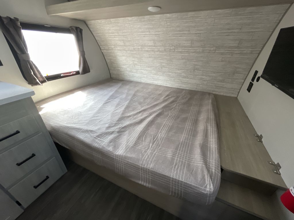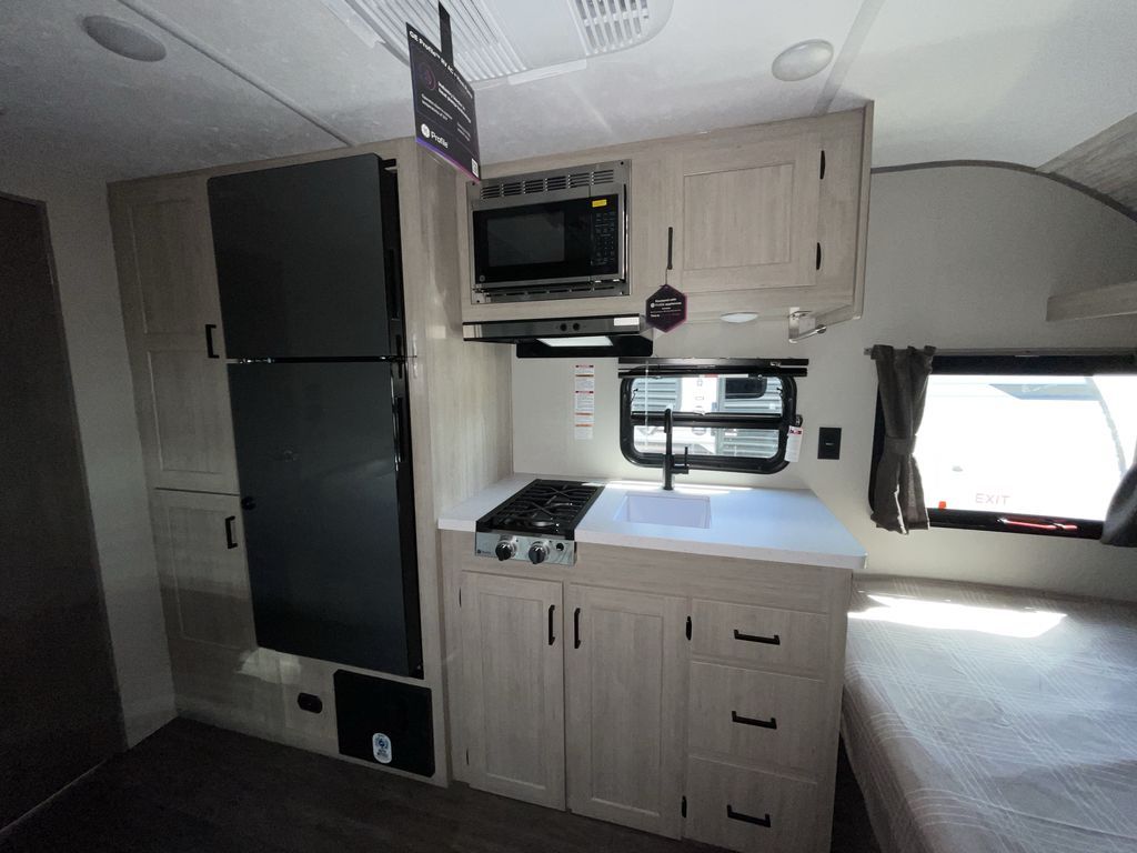 This cozy couples trailer with a queen bed is the perfect travel companion! You will have a queen bed up front to sleep on each night. The booth dinette**,** just to the left of the entry door, is a great place to enjoy meal and your morning cup of coffee! Use the two burner cooktop and microwave oven to create camp meals inside. This model includes plenty of storage space, including a large overhead in front, nightstands on either side of the sofa, a pantry for dry goods and snacks, and a linen cabinet in the rear bath that also offers a 36" x 30" shower, toilet and shelf for towels and such. There is even storage beneath the bar top as well.