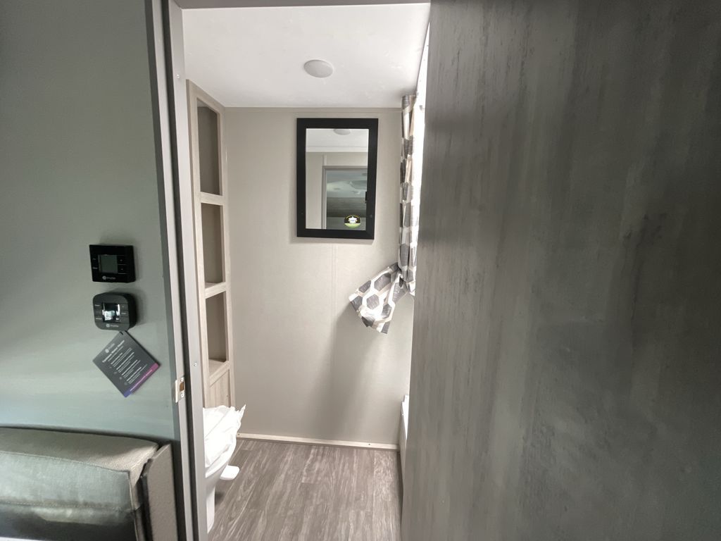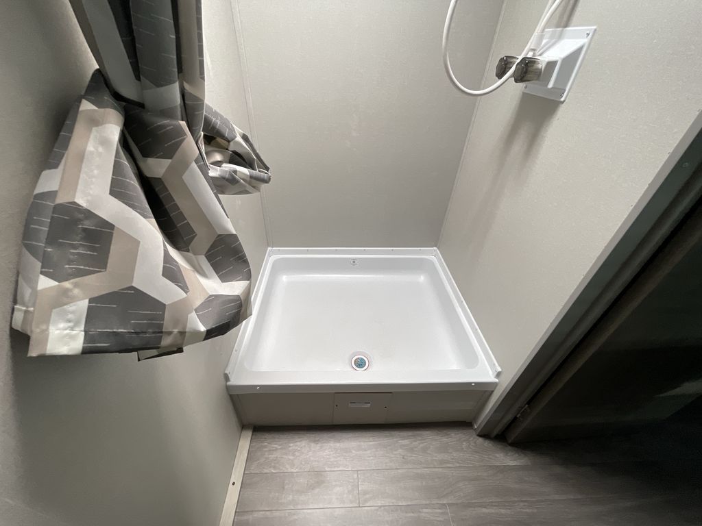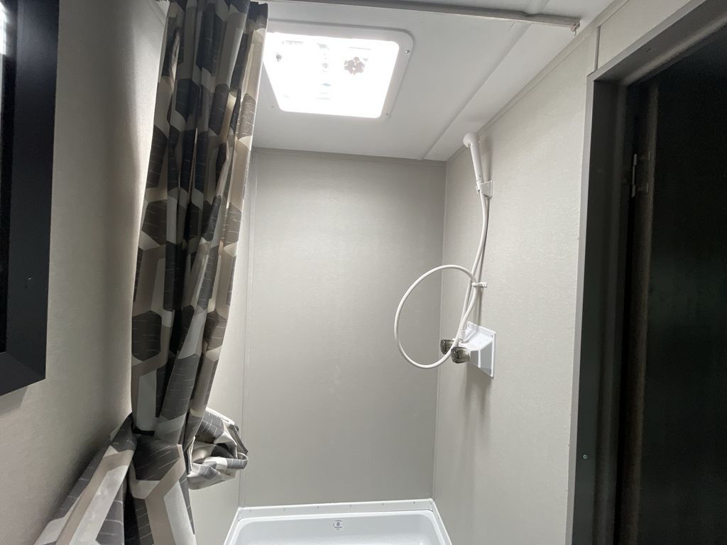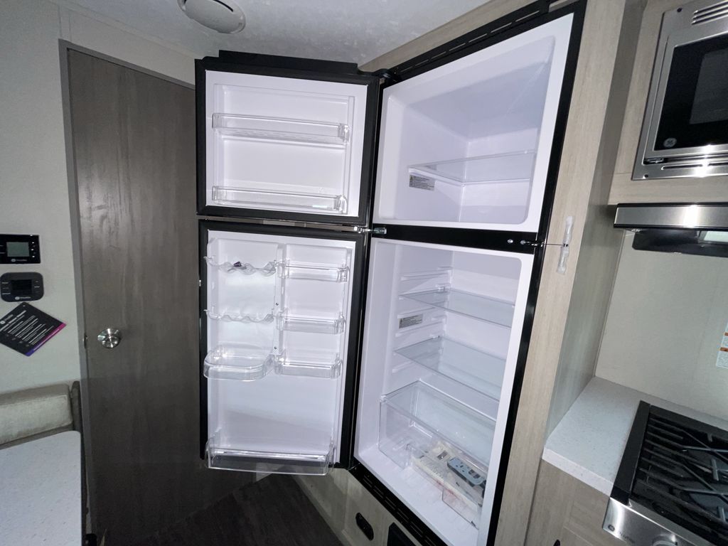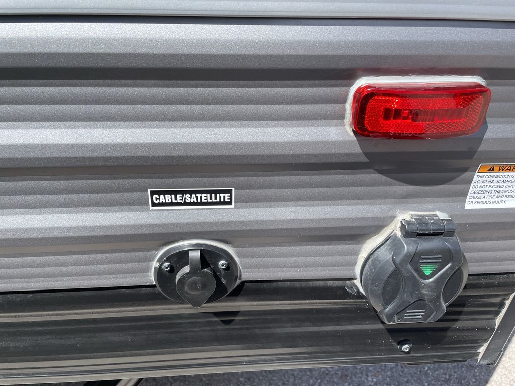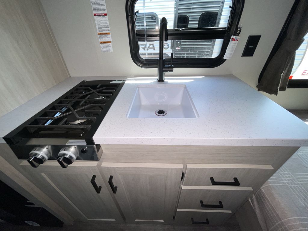 This cozy couples trailer with a queen bed is the perfect travel companion! You will have a queen bed up front to sleep on each night. The booth dinette**,** just to the left of the entry door, is a great place to enjoy meal and your morning cup of coffee! Use the two burner cooktop and microwave oven to create camp meals inside. This model includes plenty of storage space, including a large overhead in front, nightstands on either side of the sofa, a pantry for dry goods and snacks, and a linen cabinet in the rear bath that also offers a 36" x 30" shower, toilet and shelf for towels and such. There is even storage beneath the bar top as well.