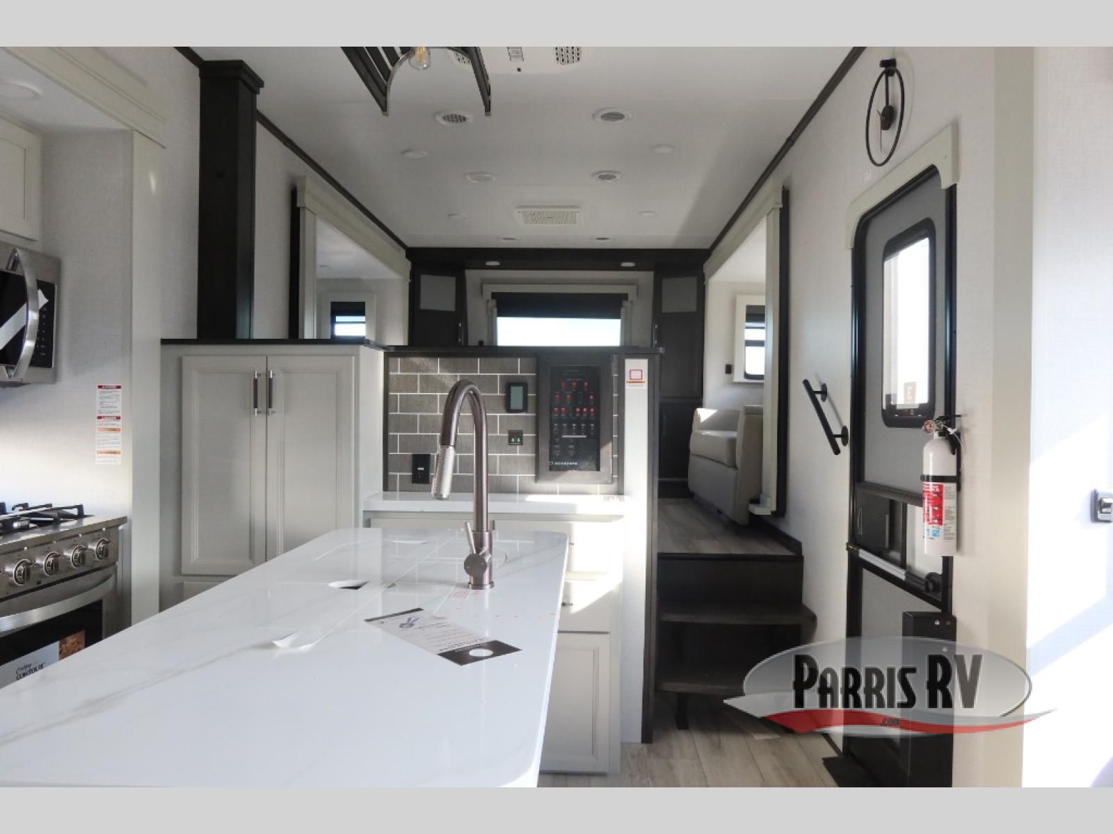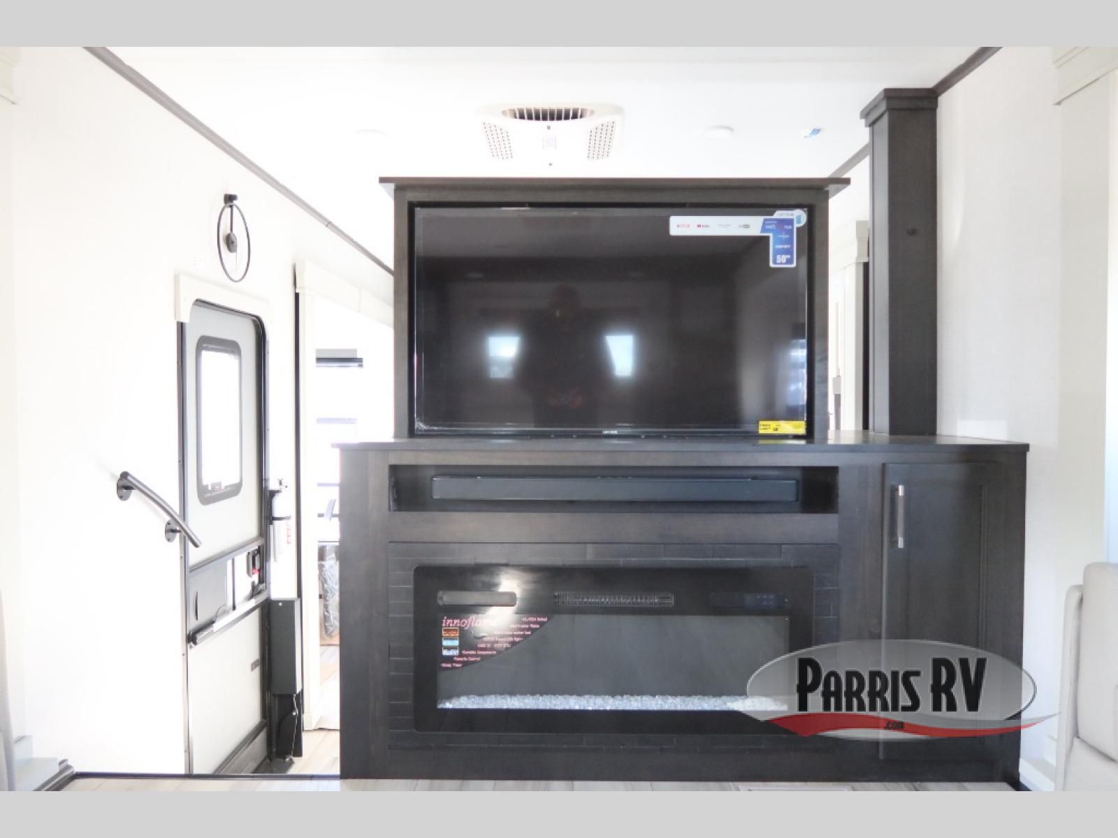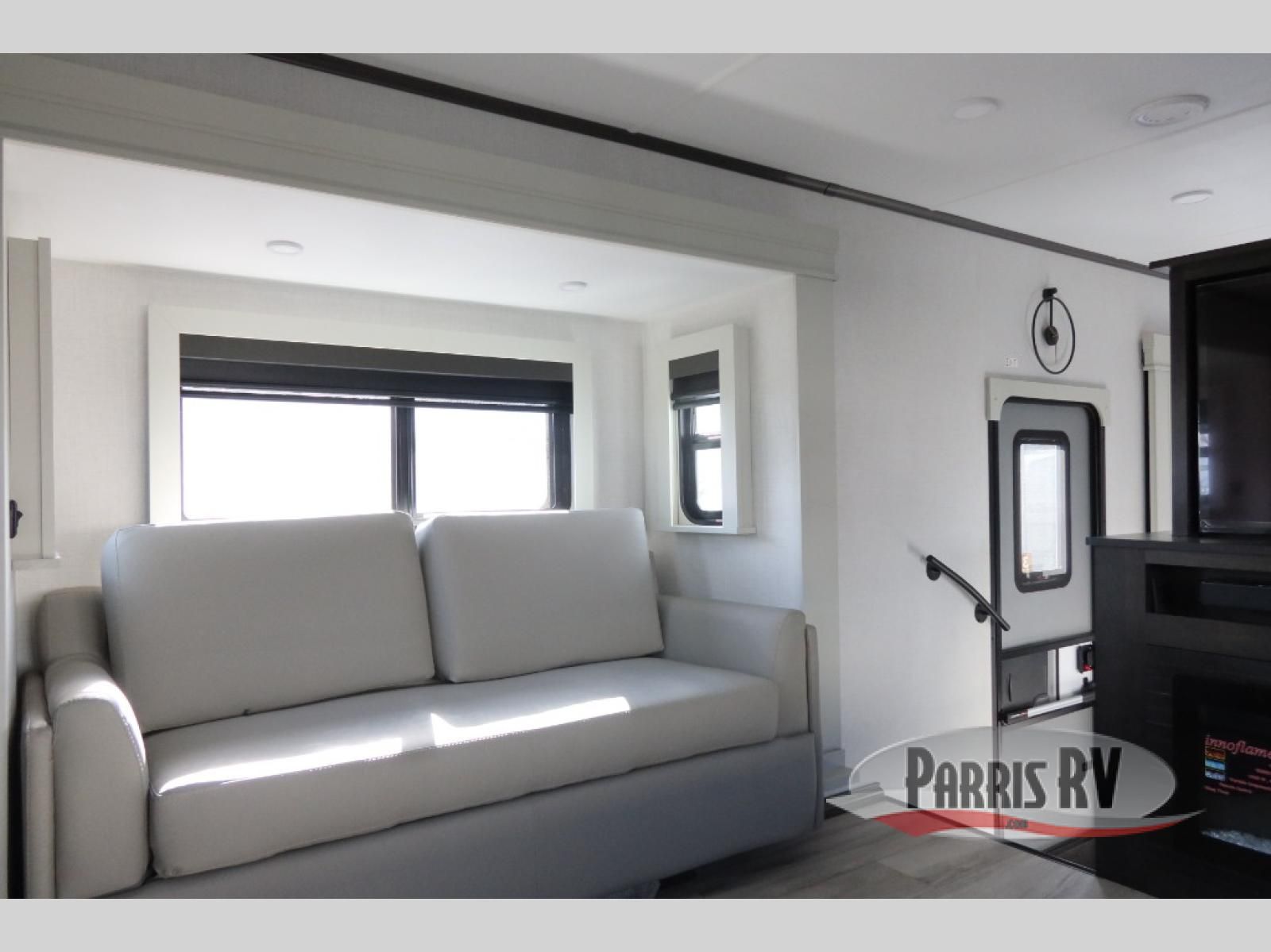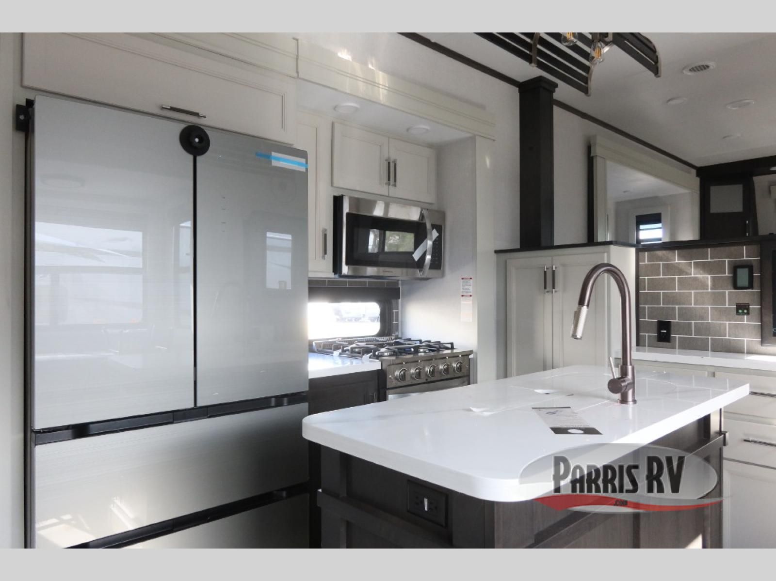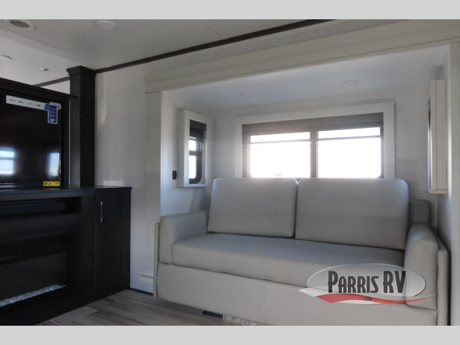 Find the comfort and luxury in this fifth wheel! Imagine your morning coffee on the spacious middle kitchen, and prepping your favorite breakfast on your kitchen island with a sink, making for a good meal-prep zone for endless cooking possibilities. You can start your favorite movie queued up in the living room with dual hide-a-bed sofas and a fireplace that sets the mood for comfort and delight every day. When it is time to unwind, your private rear bedroom welcomes you with a king bed, smart storage, and soft lighting that turns travel into rest**,** featuring a master bathroom with all you need to freshen up and treat yourself with plenty of storage, a dual sink vanity, and space for a washer/dryer prep for your convenience.